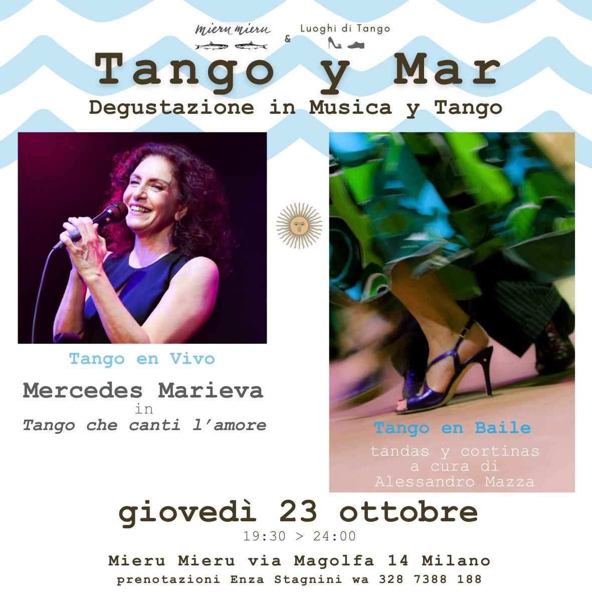 I palati più esigenti e gli appassionati delle atmosfere intime ma briose troveranno entusiasmante questa proposta pensata per tutti: Tango En Vivo: Mercede Marieva in concerto 'tango che canti l’amore', progetto e voce di Mercedes Marieva. Tango En Bailetandas y Cortinas a cura di Alessandro Mazza. Degustazione di Mieru Mieru: 5 piccoli piatti di pesce 1 dessert