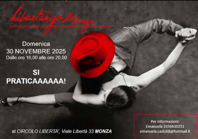 pratica Mensile di Tango – Domenica Pomeriggio dalle 16:00 alle 20:00📍 Dove: Monza Via Libertà 33 Circolo Libertà🎶 Cosa: Una pratica libera di Tango Argentino, pensata per ritrovarsi, ballare, chiacchierare e condividere la passione in un ambiente caldo e accogliente🧉 Atmosfera:  rilassata, con musica di Tango  tradizionale e spazi per socializzare💸 Ingresso: Con offerta libera – il contributo è volontario e apprezzato👥 Aperta a tutti: Non è necessario essere in coppia o iscritti a una scuola