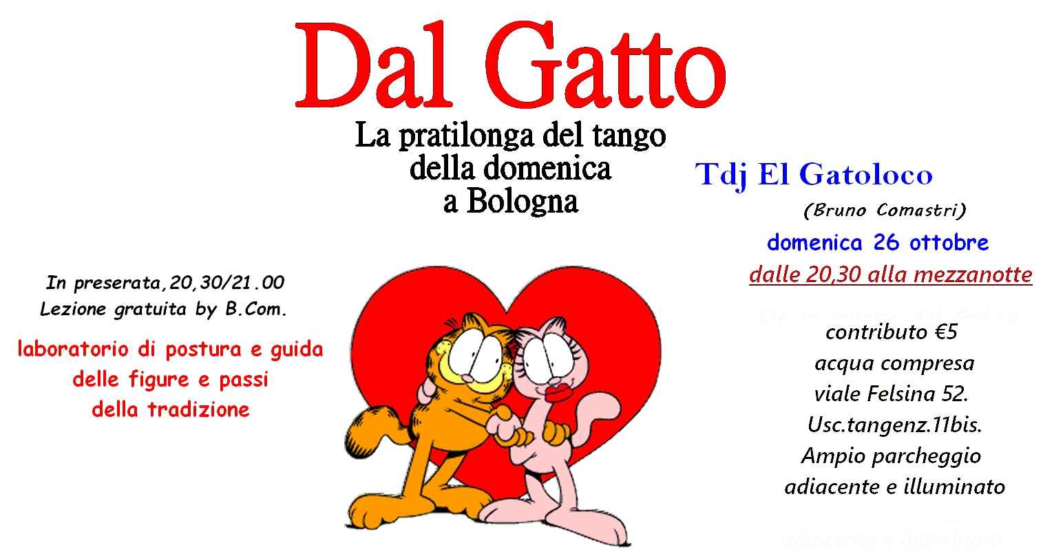 Dal Gatto - Pratilonga:20.30/21 lezione gratuita by B. Com, poi si balla il tango in tutte le sue versioni dalle 21,00 alla mezzanotte. tdj El Gatoloco (Resident) presso il circolo il Fossolo, affiliato Arci/uisp,