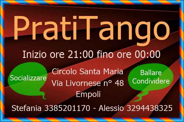 Pratitango è un'opportunità per socializzare: balliamo, ci conosciamo e gustiamo un dolcetto insieme. La pratica (con cortine) inizia alle ore 21:00 e termina alle 00:00. Pratitango Gratis ad Empoli. Un contesto semplice per condividere il nostro amato Tango. Per informazioni, è possibile contattare Stefania al numero 3385201170 o Alessio al numero 3294438325 tramite chiamata o messaggio Whatsapp. Pratitango si svolge presso il circolo di Santa Maria, in via Livornese n° 48. Grazie per l'attenzione! Alessio e Stefania.