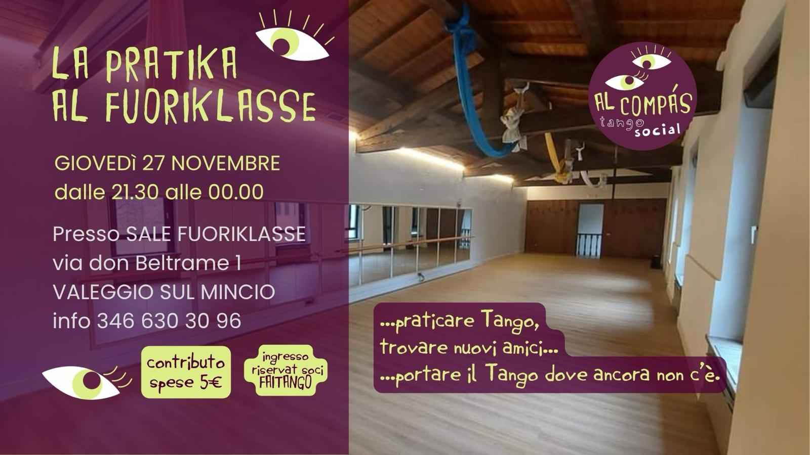 Giovedì 27 novembre, dalle 21:30 alle 00:00, vi aspettiamo alle Sale Fuoriclasse di Valeggio sul Mincio (via Don Beltrame 1) per una pratica di tango organizzata da Al Compás Tango Sociál.