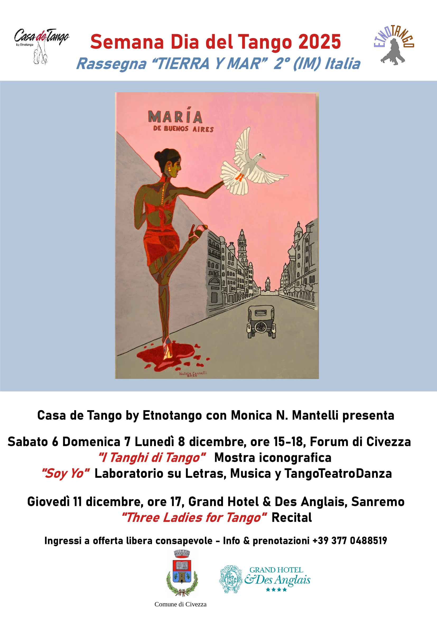 Homenaje por el Dia del Tango - Dec 2025 6-7-8 Dec hrs 15 -18 "tanghi di Tango"forum Ricca, via Manzoni 10, Civezza (Im) Exhibit Show + Letras Tangotheatre Lab 11 Dec hr 17 - 19 Three Ladies for Tango Hotel Des Anglais, Sanremo (charity event)tango Recital on Tita, Maria, Evita - Free offer Monica Mantelli & Casa de Tango by Etnotangoinfo & bookings - wzp only +39 377 0488519