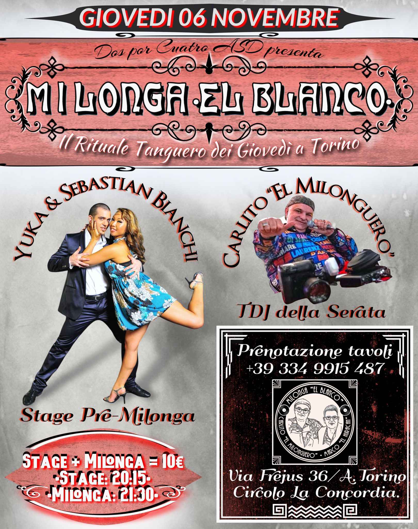 🪩milonga El Blanco 🗓️giovedi 06 Di Novembre ⚜️stage Pre~milonga con 💃yuka & Seba🕺 🕣20:15~21:15 stage!! dopo fino all’una Milonga con 🎶tdj Carlito “el Milonguero”!!!💰 Stage + Milonga= 10 € 📍 Circolo “la Concordia” Via Frejus 36 Torino.🅿️parcheggio interno disponibile solo lato ingresso milonga.🍹 Disponibile il servizio bar interno alla sala.🚸info Stage Y&s +39 327 85 60 253🪑 Prenotazione tavoli al Numero +39 334 99 15 487 è consigliata!👉link Evento: https://www.facebook.com/share/17FjtwLHke/?mibextid=wwXIfr Y&S👨💻Website: https://nuestrotangodance.wixsite.com/yuka-seba/it🤗Il Giovedì è meglio con voi!! Ci vediamo!!💃yuka & Seba🕺🎧tdj Carlito “el Milonguero”🎧🎧tdj Marco “el Huracan”🎧🎥video Stage: https://youtube.com/shorts/7vKfkq4hmJ8?feature=share#tangoitalia #tangopiemonte #tangoeuropa #tangostage #tangodance #tangotorino #tangonight #tangoatorino #tangotime #milonga