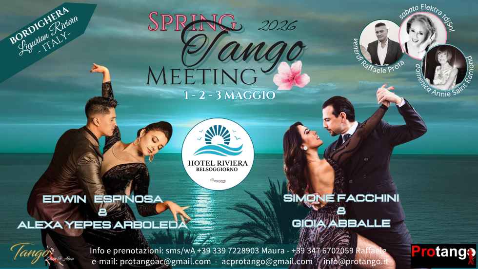 fr - Cette édition du spring Tango Meeting aura lieu les 1er, 2 et 3 mai 2026 et accueillera deux duos de professeurs exceptionnels :pour la première fois,simone Facchini & Gioia Abballeedwin Espinosa & Alexa Yepes Arboleda, les professeurs principaux de l’événement.cette année, nous vous offrons la possibilité de passer un long week-end sur la Riviera, en combinant toutes les activités avec un séjour à l’hôtel Riviera Belsoggiorno, niché sur les collines verdoyantes de Bordighera et offrant une vue imprenable sur la mer. *************** Programme Complet ****************vendredi 1er Mai13h00/15h00 Inscriptions et arrivée en chambredÉbut Des Stages15h30/16h45 Edwin & Alexa