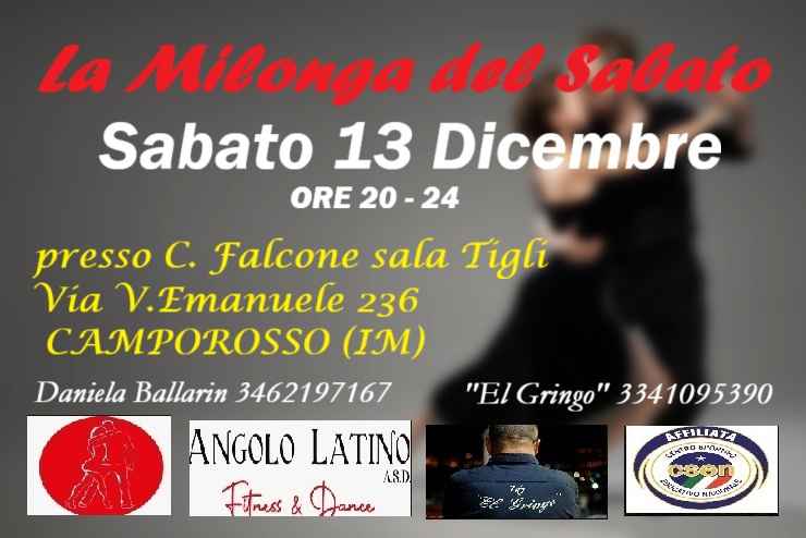 La A.s.d. Angolo Latino Fitness e Dance e "el Gringo Entertainment" organizzano Sabato 13 Dicembre "la Milonga Del Sabato Sera" dalle ore 20 alle 24 presso il centro polivalente C. Falcone sala "tigli" in via Vittorio Emanuele 236 - Camporosso - (Im) . Ampio parcheggio adiacente . Ingresso Euro 15,00. "el Gringo Tdj" la musica per tutti. Info e prenotazioni : Daniela 3462197167 whatsapp ."el Gringo" sms 3341095390.