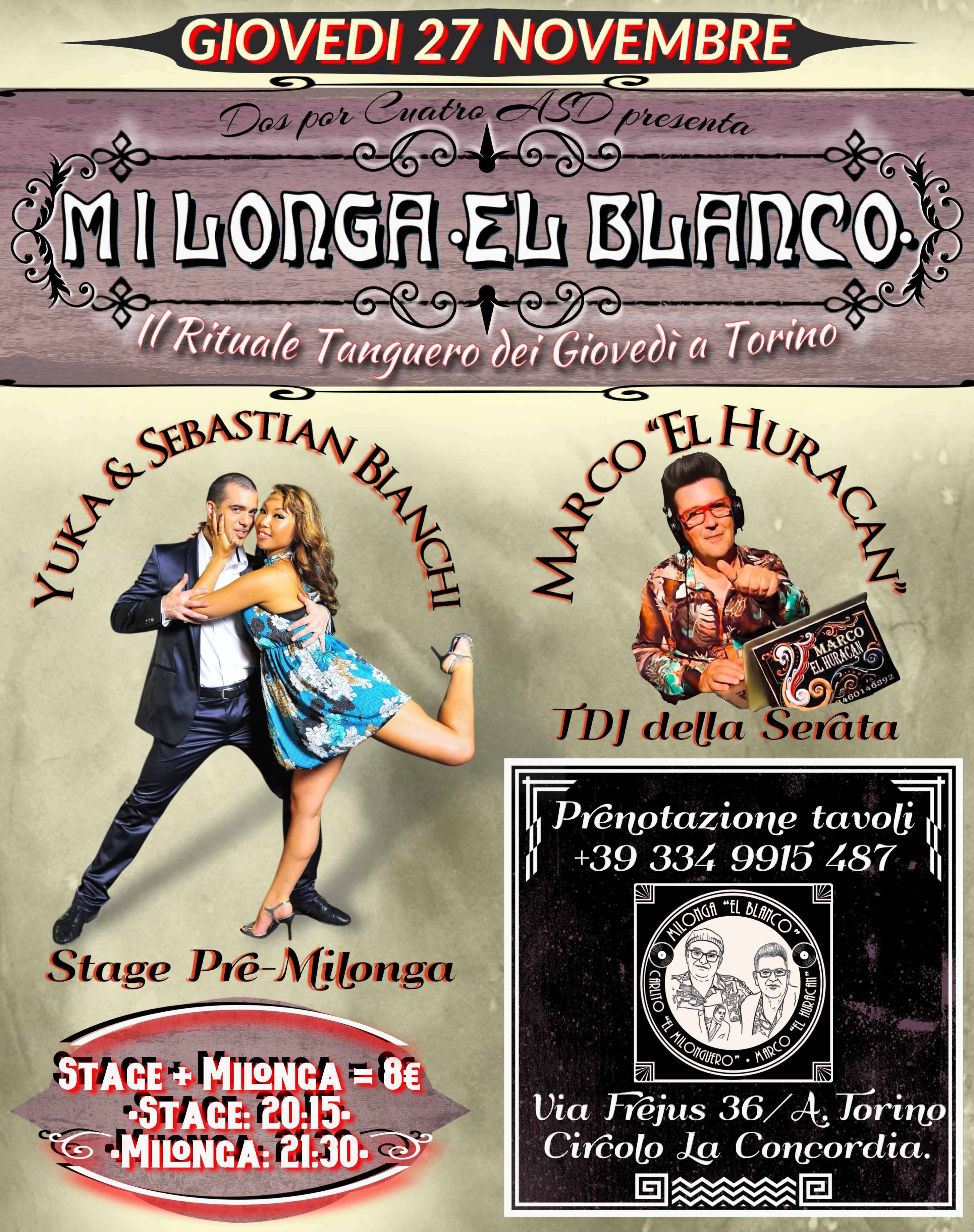 🪩milonga "el Blanco"🗓️giovedi 27 Novembre ⚜️stage con 💃yuka & Seba🕺 💰 Stage + Milonga= 10€ 🕣20:15~21:15 Stage!! dopo fino all’una Milonga con 🎶tdj Marco El Huracan🌪️!!! 📍 Circolo “la Concordia” Via Frejus 36/a Torino.🅿️parcheggio interno disponibile solo lato ingresso milonga.🍹 Disponibile il servizio bar interno alla sala.🪑 Prenotazione tavoli al Numero +39 334 99 15 487 è consigliata!🚸info Stage Yuka & Seba: +39 327 85 60 253👉evento: https://fb.me/e/3Vh1l1Q2S