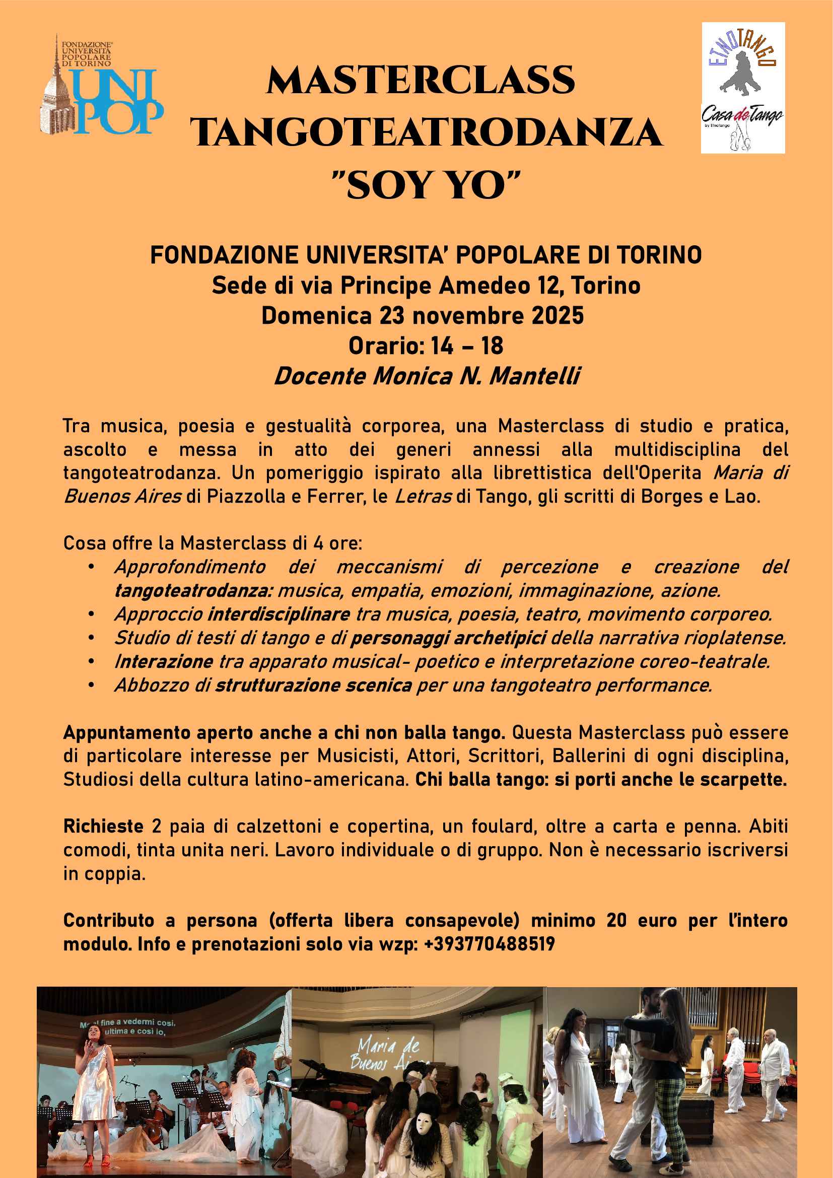 Tra musica, poesia e gestualità corporea, un laboratorio di studio e pratica, ascolto e messa in atto dei generi annessi alla multidisciplina del tangoteatrodanza, partendo dalla librettistica dell'operita "maria di Buenos Aires" fino alle Letras de Tango estratte dal repertorio 1906 - 1950 circa.