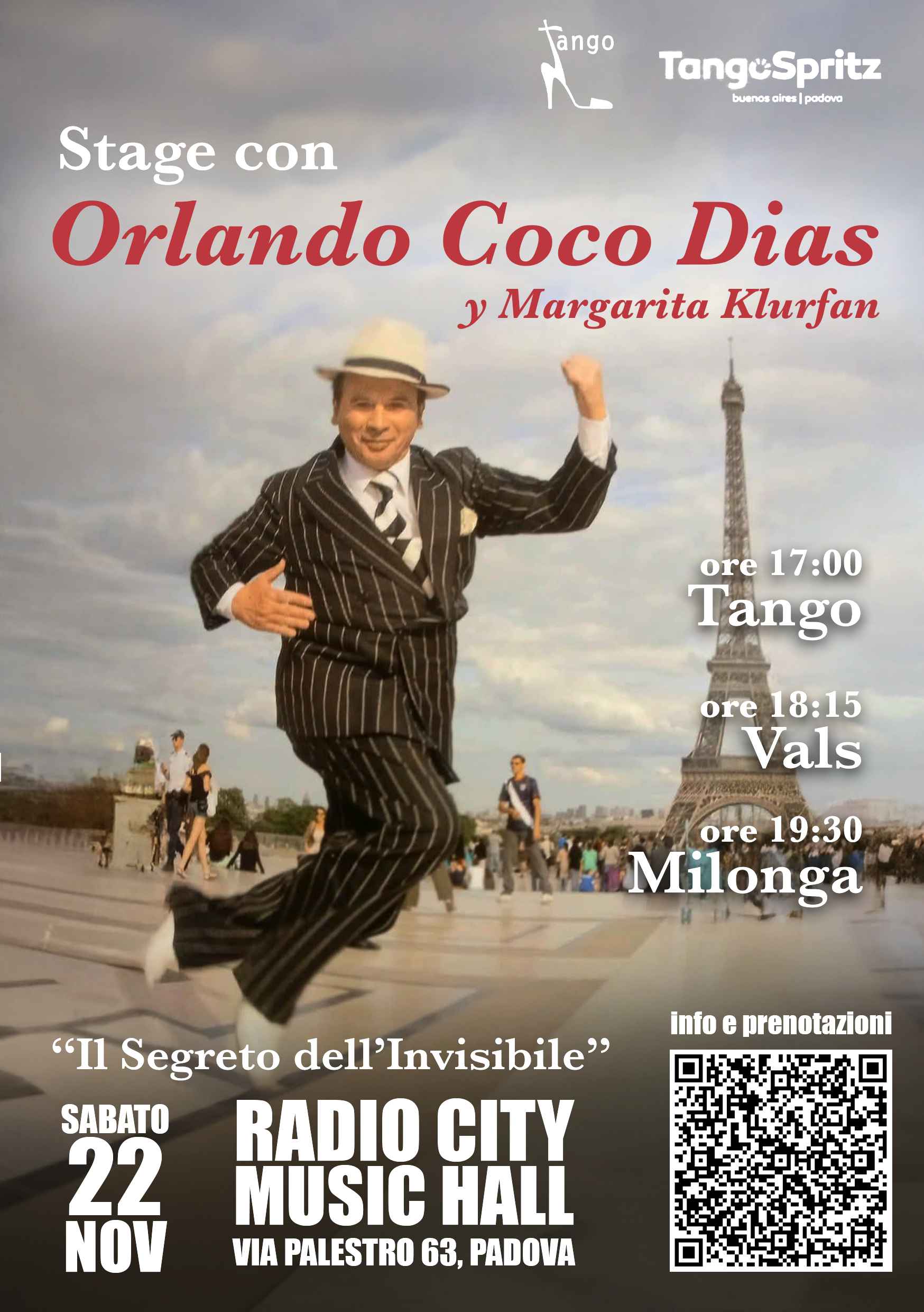 Dopo 25 anni, Orlando Coco Dias torna in Italia per la prima volta. Il Segreto dell’Invisibile Come da tradizione del Maestro, il filo conduttore degli stages sarà Il Segreto dell’Invisibile: un percorso che va oltre la tecnica e le figure per toccare la vera essenza del tango.