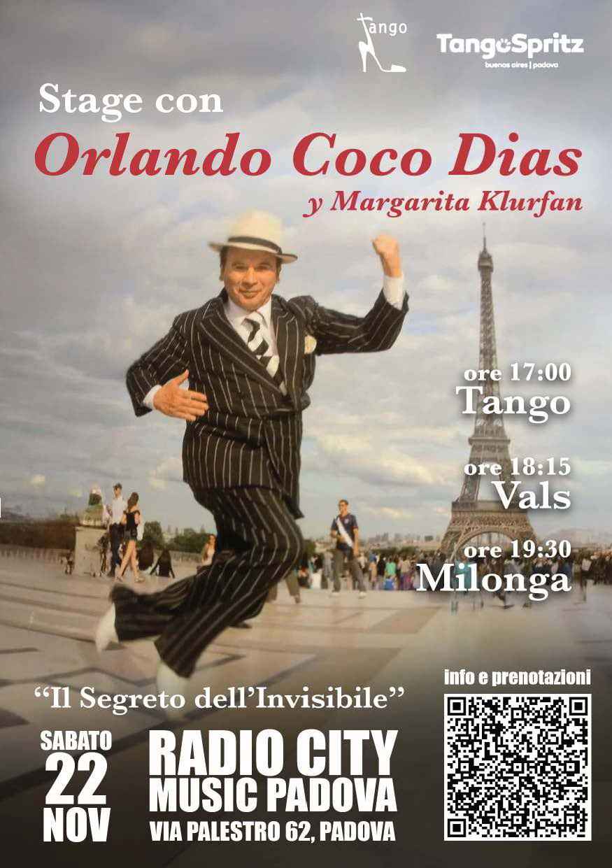 Dopo 25 anni, Orlando Coco Dias torna in Italia per la prima volta. Il Segreto dell’Invisibile Come da tradizione del Maestro, il filo conduttore degli stages sarà Il Segreto dell’Invisibile: un percorso che va oltre la tecnica e le figure per toccare la vera essenza del tango.