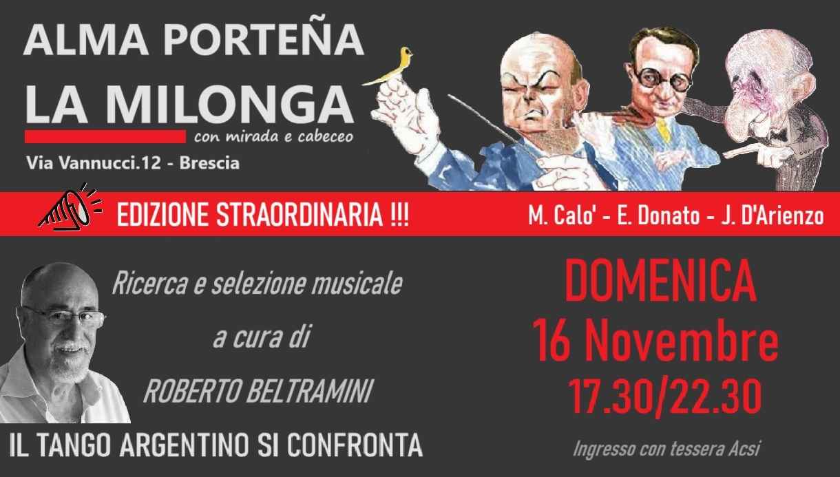 alma Porteña la Milonga edizione straordinariamilonga a tema. Il Tango Argentino Si CONFRONTA Juan D’arienzo, Miguel Calò e francisco Canaro nelle serate abituali di milonga le orchestre tipiche vengono proposte per ovvi motivi di condivisione in un limitato numero di volte. in questa edizione straordinaria daremo spazio a Tre importanti orchestre. Juan D’arienzo, Miguel Calò e Edgardo donato. orchestre stilisticamente diverse tra loro ma con brani specificatamente adatti e rivolti al ballo. la serata si svolgerà con brani legati agli anni 40 e dintorni denominata “l’epoca d’oro”. le tande saranno proposte in modo opportunamente alternato. nella serata non si propone un confronto, ma una fusione di stili: · moderatamente ritmato per Edgardo Donato. · tranquillo e romantico per Miguel Calò. · decisamente ritmato per el Rey del Compas Juan D’Arienzo. ♪ Ricerca e Selezione musicale a cura di Roberto Beltramini.
