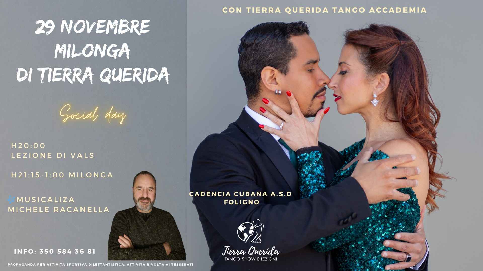 Una milonga dove ballare, divertirti e socializzare con la nostra grande famiglia di Tierra Querida Tango. musicalizador della serata: Michele Racanella - una selezione musicale che ti farà immergere completamente nell'atmosfera del tango.