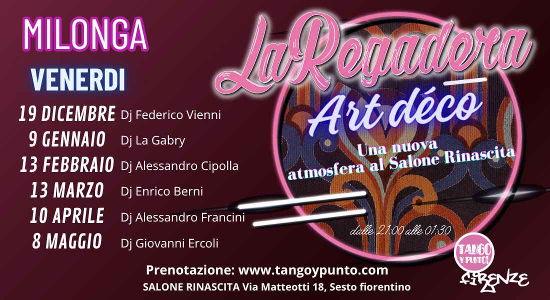La Regadera si trasforma e apre le porte a una serata dal fascino intramontabile: nasce La Regadera Art Déco, un viaggio elegante e seducente nell’estetica degli anni ’20 e ’30, dove il tango trova una cornice nuova, ricca di stile, geometrie raffinate e luminosità d’altri tempi. lasciati avvolgere da un ambiente rinnovato, in cui forme, luci e dettagli Art Déco si intrecciano con l’abbraccio del tango, dando vita a una milonga che accende i sensi e amplifica le emozioni.