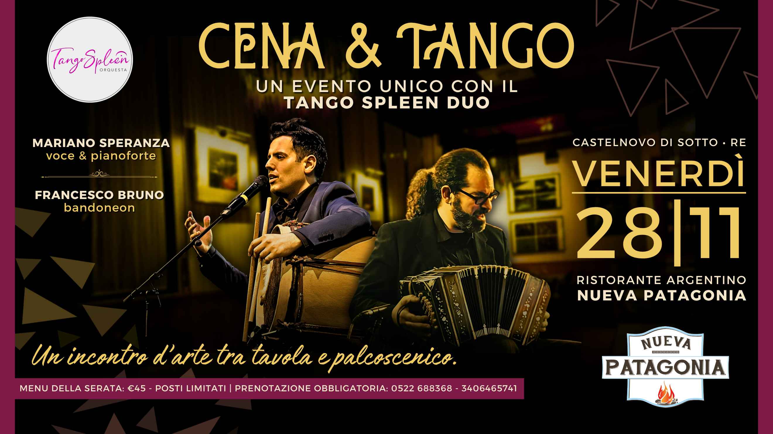 Mariela e Graziano, insieme a tutto lo staff, vi accolgono come a casa per una serata imperdibile dedicata alla musica, al gusto e alla cultura argentina.il Ristorante Nueva Patagonia, con la sua atmosfera calda e accogliente, vi farà vivere un’esperienza autentica: dai tagli di carne selezionati alla brace, alle empanadas fatte a mano, fino ai dolci artigianali che raccontano la tradizione del paese del tango.durante la serata, la magia del tango prende vita con il Tango Spleen Duo, formato da due artisti di rilievo internazionale: