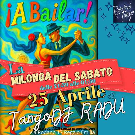 *passione Tango: Un Sabato Da Vivere In Un Abbraccio!* Il *25 Aprile* al Barrio non è una data come le altre, ma non per i soliti cliché. È la giornata in cui celebriamo l'amore più grande: quello per il Tango e per la nostra splendida comunità! Torna *a Bailar,* l’appuntamento del sabato a Reggio Emilia Perché questo sabato sarà imperdibile? *divertimento* dalle 21:30 fino all'01:30! *in console:* tango Dj Radu Tanasescu *musica per l'anima:* le selezioni più belle e coinvolgenti per una milonga che ti farà dimenticare l'orologio.che tu venga da solo, con amici o in compagnia, al Barrio troverai sempre l'abbraccio che cerchi. È il sabato perfetto per staccare la spina e immergersi nella musica che amiamo. *dove:* Via Rodano 17, Reggio Emilia *quando:* Sabato 25 Aprile *orario:* 21:30 - 01:30 *ingresso* soci Acsi. *contributo* Eur 10,00.vieni a festeggiare la tua passione con noi. Ti aspettiamo per fare il pieno di energia e tande indimenticabili!