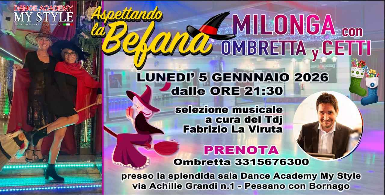 Lunedi 5 Gennaio 2026 Ombretta e Cetti per un altro evento insieme organizzano La Milonga "aspettando La Befana" nella splendida sala di Dance Academy My Stylepessano con Bornago Via Achille Grandi 1