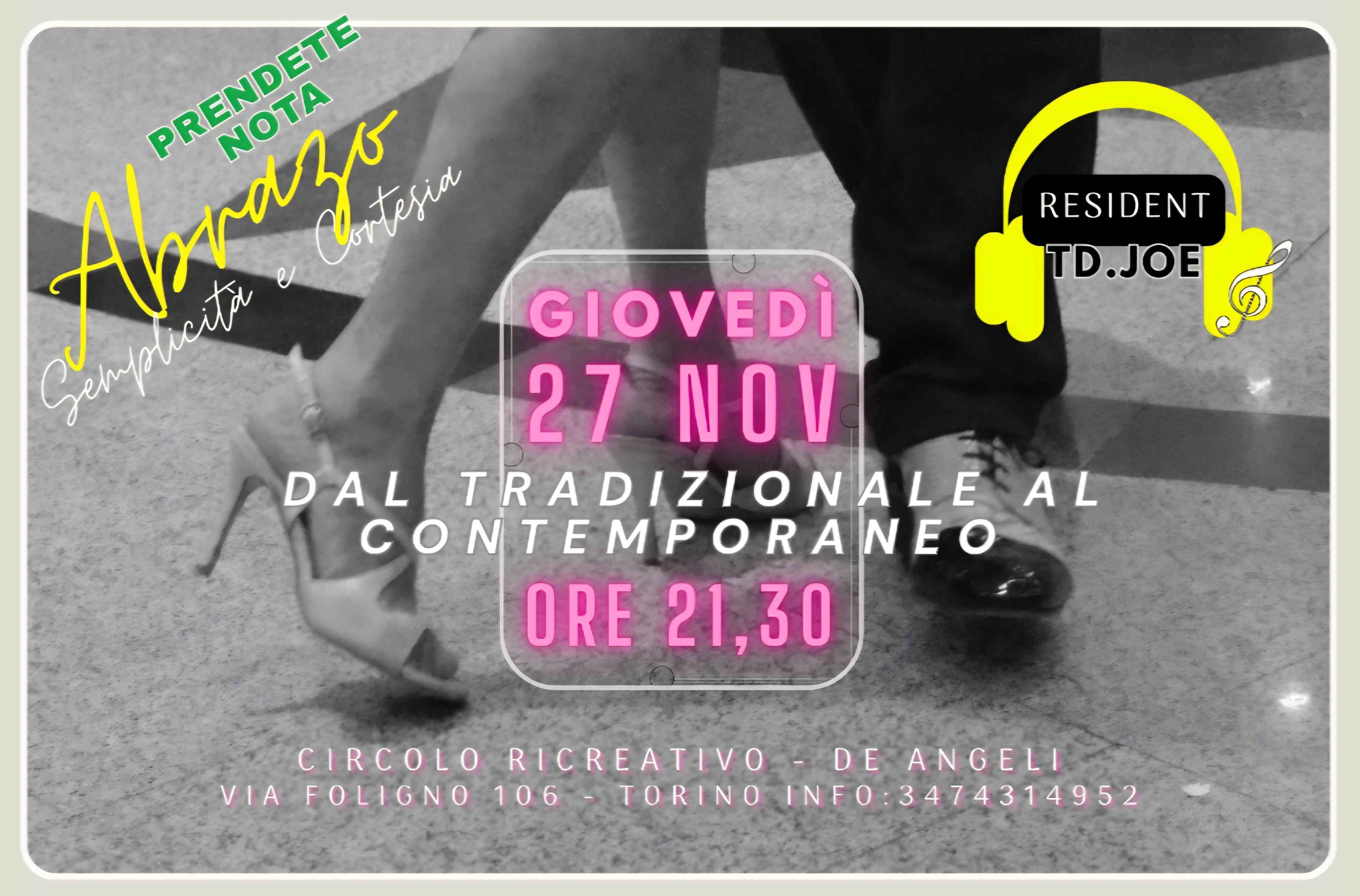 M I L O N G A D E L L' A B R A Z Oabrazo la Milonga dove si balla, si chiacchera, si sta insieme in allegria!giovedi dalle 20,30 alle 21,30 Quarto ed ultimo appuntamento Stage di Musicalita' su Tango Nuevo appuntamento settimanale su -vals-milonga-tango-nuevo, con Vittoria e Ruggero, a seguire Milonga dal Tradizionale al Contemporaneo la selezione musicale sarà a cura del Tdj. Joe si balla fino alle 0,30.contributo Stage + Milonga 8€ solo Milonga 5€, pista da ballo di 200 metri quadri locale climatizzato acqua free.