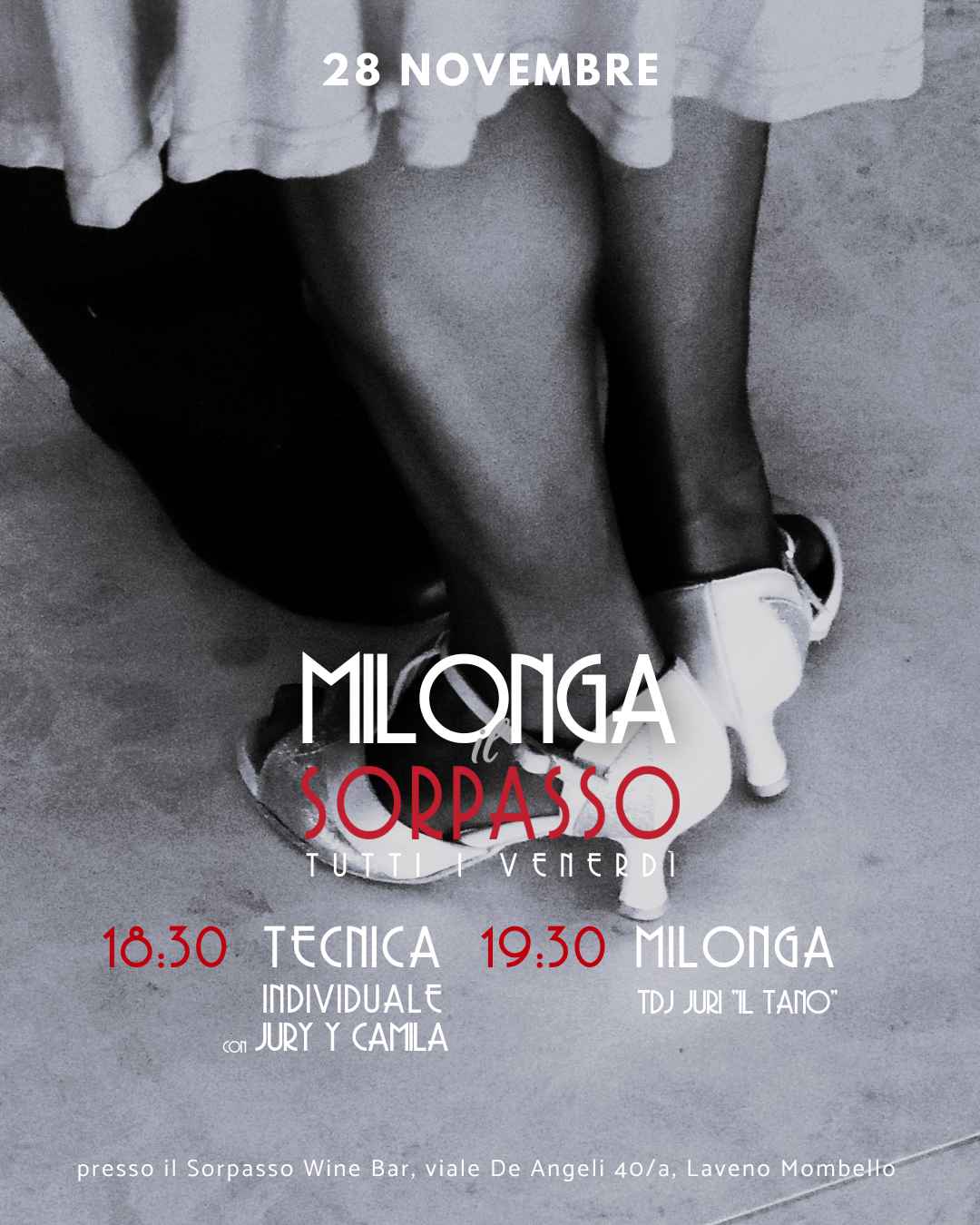 L'entrata in Milonga da diritto ad acqua illimitata e per tutti i venerdí di novembre a una consumazione inclusa (bicchiere di vino, spritz o analcolico).