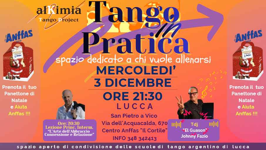 ■ Vi ricordiamo che la serata è una Pratica di Tango, un momento di studio e non ha finalità di lucro.le offerte all’ingresso di minimo 7 euro sono destinate interamente a pagare i costi di riscaldamento ed elettricità della struttura e saranno interamente devoluti all’associazione Onlus ospitante A.n.f.f.a.s. di Lucca.https://anffaslucca.org/.../il-cortile-di-casa-nostra.../