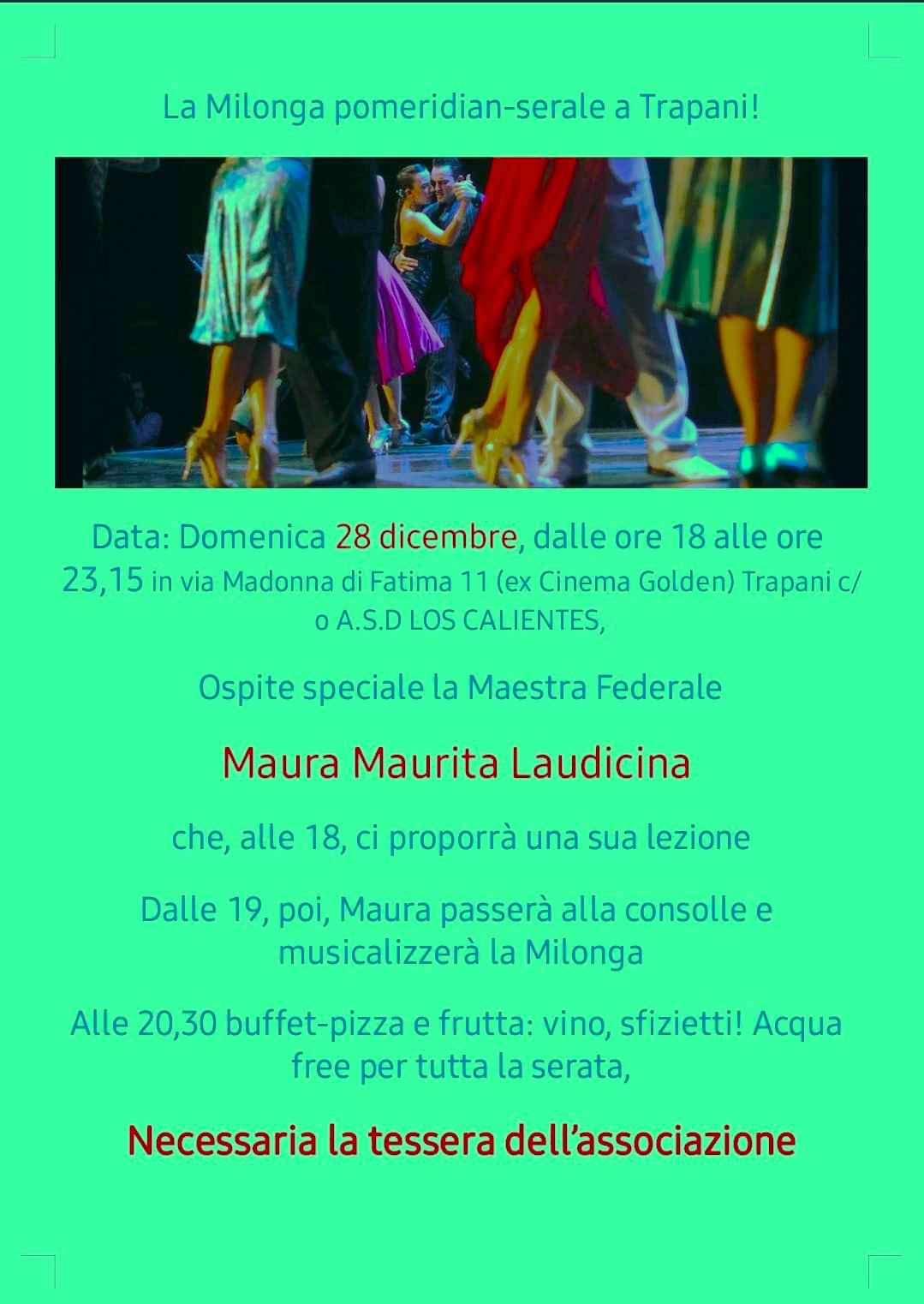 Proponiamo la formula pomeridiano/serale ed un'apertura di evento divertente e sempre differente: In questa serata, alle 18 per chi sarà puntuale, la Maestra federale Maura Maurita Laudicina, condurrà una lezione trasversale, dopodiché, dalle 19, sempre Maura, nel ruolo di  Tdj, ci proporrà la sua personale selezione di Tanghi, Vals e Milonghe. Verso le 20,30 verrà aperto il Buffet per ricaricare le energie.                                                                                                                                                                                                                                                                                                                                                                                                                                                                l'ingresso prevede il possesso della tessera dell'a.s.d.: contattando l'organizzatrice potete avere via whatsapp il modulo di adesione, da procurarsi prima della domenica. Tessera annuale Csein €.7 contributo per la serata €.10