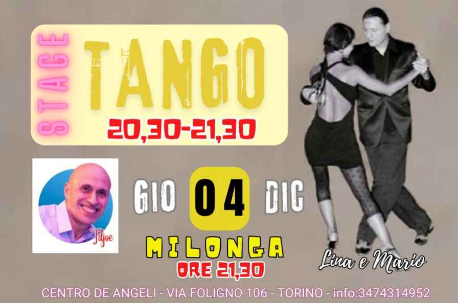 Stage Di Tango Alla M I L O N G A D E L L' A B R A Z Oabrazo la Milonga dove si balla, si chiacchera, si sta insieme in allegria!giovedi 04 Dicembre dalle 20,30 alle 21,30 appuntamento settimanale di Tango con Lina e Mario a seguire Milonga dal Tradizionale al Contemporaneo la selezionemusicale sarà a cura del Tdj.joe si balla fino alle 0,30.contributo Stage + Milonga 8€ solo Milonga 5€, pista da ballo di 200 metriquadri locale climatizzato acqua free.comodo il parcheggio nelle vicinanze.come raggiungerci: Siamo a 10 minuti per chi viene dal centro, e a pochiminuti dall'uscita Tangenziale Corso Regina Margherita direzione Ovestverso Corso Potenza, proseguire e svoltare a sinistra via Forlì il numerocivico 106 lo trovate sulla destra così sarete arrivati.circolo Ricreativo De Angeli Arci riservato ai Soci.come Arrivare da Noi: https://maps.app.goo.gl/Wa2Rg8rKeVzVoWGc7Dove Parcheggiare: https://maps.app.goo.gl/ddyousPCjvbmxeRn6Via Foligno 106 Torino Per informazioni e prenotazioni Tel. 3474314952