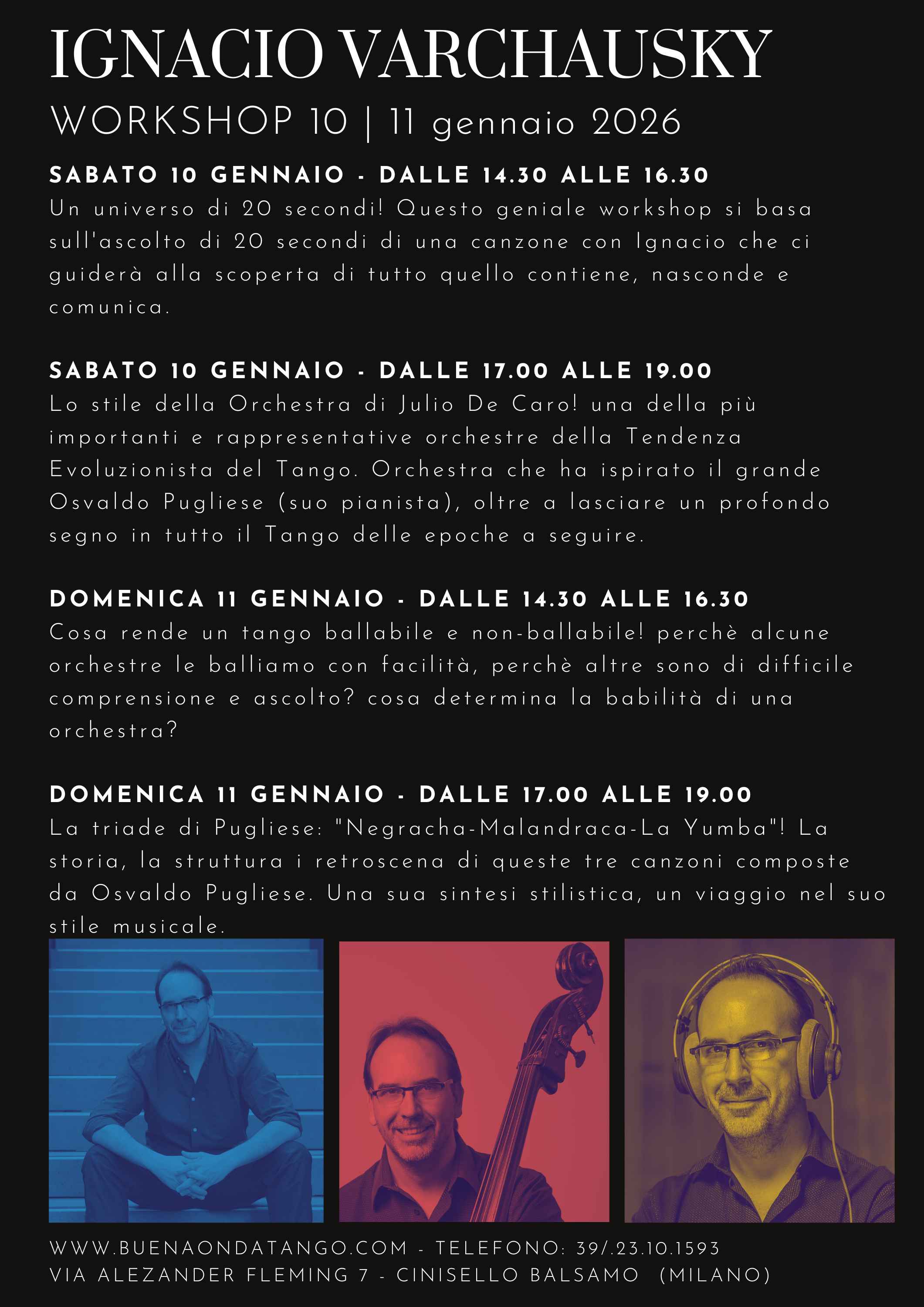 Ignacio è uno dei più grandi esperti al mondo della musica del Tango. Ha un curriculum di grande spessore come musicista, direttore di orchestra e conoscitore della musica del tango.i suoi video hanno centinaia di migliaia di visualizzazioni e viaggia per tutto il mondo portando la sua cultura tanguera nei più grandi conservatori e atenei.i suoi seminari sono utilissimi per ballerini, Dj, musicisti e semplici appassionati. La sua struttura pedagogica è chiara assertiva e di grandi contenuti.TEMATICHE Dei WORKSHOPLa danza è una forma di performance musicale. Chi danza interpreta dal proprio sguardo tutto ciò che ascolta e sente. In questi seminari approfondiremo una serie di elementi e logiche che attraversano il linguaggio orchestrale del tango, effettuando uno studio comparativo tra orchestre. Elementi condivisi ed elementi esclusivi definiscono il discorso stilistico di ogni orchestra, riconoscerli e comprenderli è il primo passo per poterli interpretare e sviluppare così la nostra personalità nella danza.QUANDO:SABATO 10 Gennaio - Dalle 14.30 Alle 16.30Un universo di 20 secondi! Questo geniale workshop si basa sull'ascolto di 20 secondi di una canzone con Ignacio che ci guiderà alla scoperta di tutto quello contiene, nasconde e comunica. Sabato 10 Gennaio - Dalle 17.00 Alle 19.00Lo stile della Orchestra di Julio De Caro! una della più importanti e rappresentative orchestre della Tendenza Evoluzionista del Tango. Orchestra che ha ispirato il grande Osvaldo Pugliese (suo pianista), oltre a lasciare un profondo segno in tutto il Tango delle epoche a seguire. Domenica 11 Gennaio - Dalle 14.30 Alle 16.30Cosa rende un tango ballabile e non-ballabile! perchè alcune orchestre le balliamo con facilità, perchè altre sono di difficile comprensione e ascolto? cosa determina la babilità di una orchestra? Domenica 11 Gennaio - Dalle 17.00 Alle 19.00La triade di Pugliese: "negracha-malandraca-la Yumba"! La storia, la struttura i retroscena di queste tre canzoni composte da Osvaldo Pugliese. Una sua sintesi stilistica, un viaggio nel suo stile musicale. COSTIil costo per ogni singolo workshop con Ignacio è di 30 euro a partecipante. ISCRIZIONIPer iscriverti ai seminari di Ignacio, compila il form che trovi al seguente indirizzo: https://forms.gle/AU1neAAuvRv2YGCU8Questo evento si terrà a Cinisello Balsamo (Milano), Via Alexander Fleming 7 ed è possibile accedervi solo ed esclusivamente con la tessera Acsi - Faitango. Siamo a 3 minuti dall'uscita dell'autostrada A4 - Tangenziale Nord.Grande disponibilità di parcheggio in zona. Per eventuali informazioni scrivere a o segreteria@caterinacuppari.com o contattateci al 3923101593 (Caterina) - 3921410044 (Filippo).a presto!caterina e Filippo