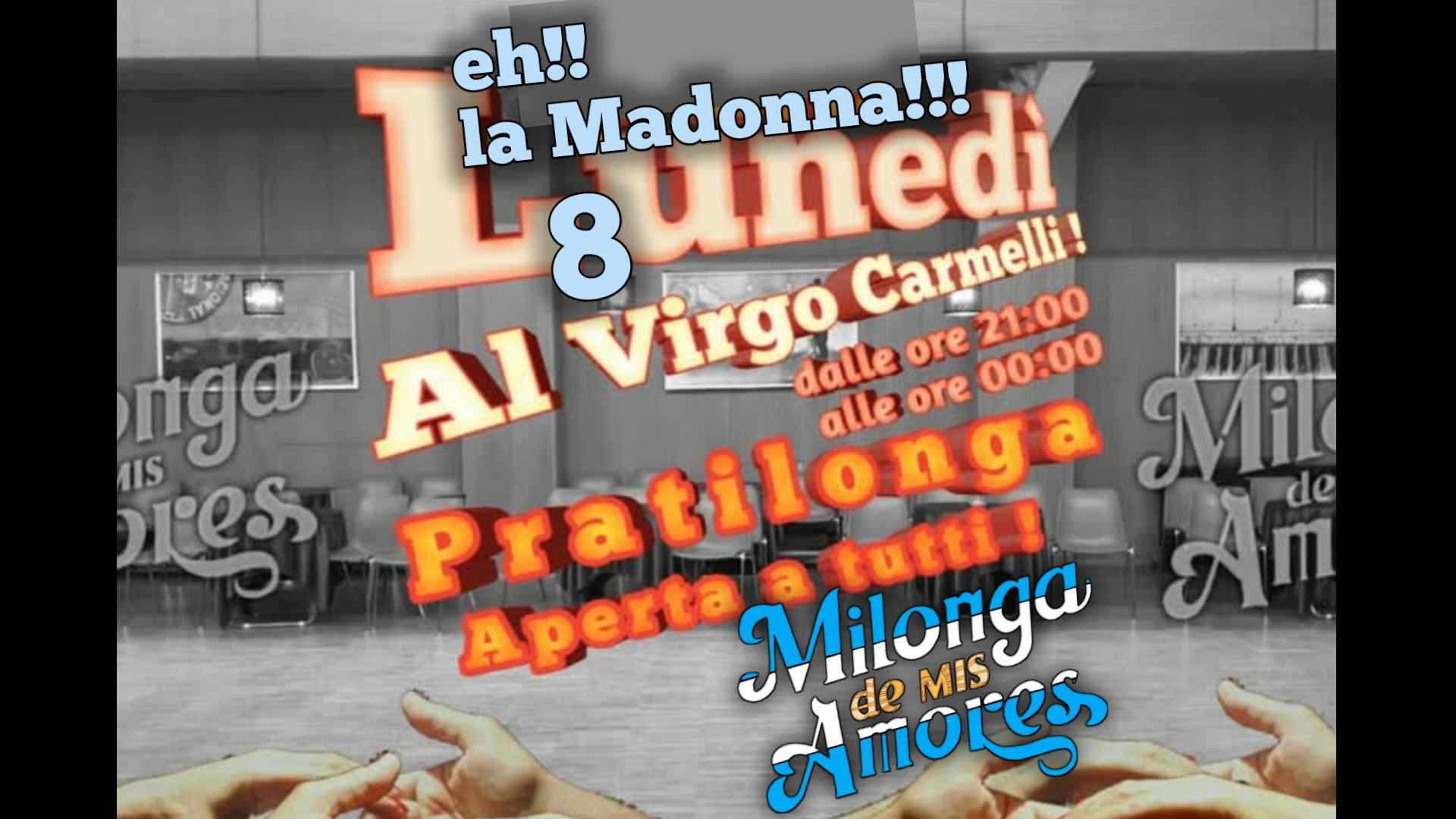 - La pratilonga del Lunedì della madonna !!!-- La pratica del Lunedì al istituto Virgo Carmeli.- Inizio alle ore 21:10 -- fino alle ore 23:59 --- Garantito da bere -- Uno spazio dove mettere in pratica quello che si studia a lezione e migliorare condividendo il Tango, ascoltare bene della bella musica fare due chiacchiere e -- ballare Tango Argentino sul migliore pavimento in legno massello di Verona.-- Rinfresco a volontà, € 8-- Non Serve Tessera Alcuna-- Pratica aperta a tutti quelli che ballano Tango Argentino.-- Per info: Titti 339 2320594 -- Istituto Virgo Carmeli via Carlo Alberto, 26 Golosine Verona -