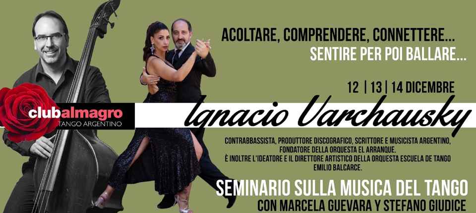 ascoltare, Comprendere, Connettere… Sentire Per Poi Ballare…seminario intensivo per ballerini, Dj e musicisti, con Ignacio varchausky con enorme piacere ed emozione, dopo anni di desiderio di organizzare questa straordinaria proposta per il pubblico tanguero torinese, finalmente si concretizza uno dei seminari di musicalità più interessanti e approfonditi, con un artista meraviglioso che ci guiderà alla scoperta delle chiavi fondamentali per interpretare la musica del Tango con passi di danza più attenti e dedicati. venerdì 12 - Sabato 13 e Domenica 14 dicembre grande Seminario sulla Musica del Tango con Ignacio varchausky, contrabbassista, produttore discografico, scrittore e musicista argentino, fondatore dell'orchestra El arranque nonché ideatore e direttore artistico dell'orquesta escuela de Tango Emilio balcarce. argomenti del Seminario:venerdì 12 dicembre ore 20.00 – 22.00