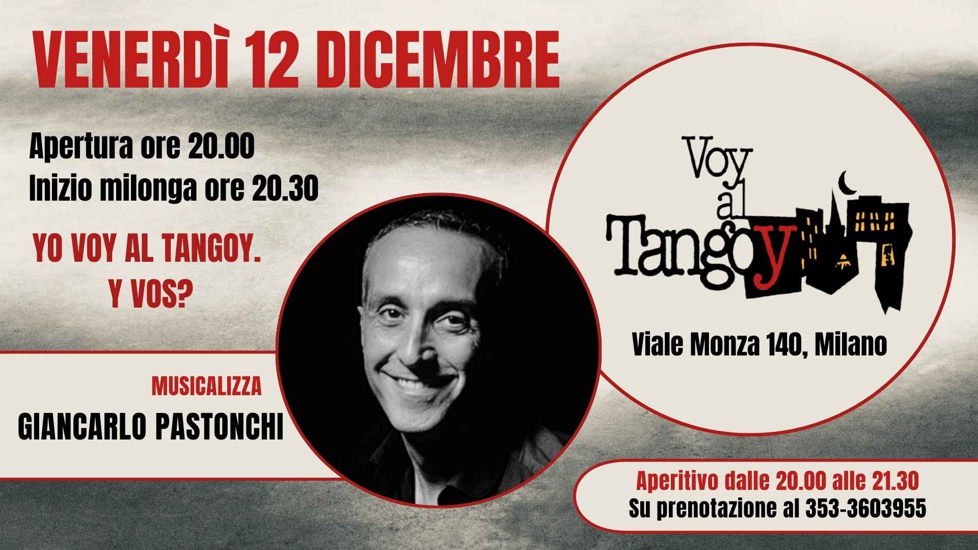 La storica milonga Tangoy di Milano ora si chiama Voy al Tangoy! Nuova direzione artistica, nuovo orario, nuova gestione. Venerdì 12 dicembre ci farà ballare un Tdj per la prima volta alla consolle della nostra milonga: Giancarlo Pastonchi. Apertura ore 20.00. Inizio milonga ore 20.30. Chiusura milonga ore 01.00. Biglietto d'ingresso €10.