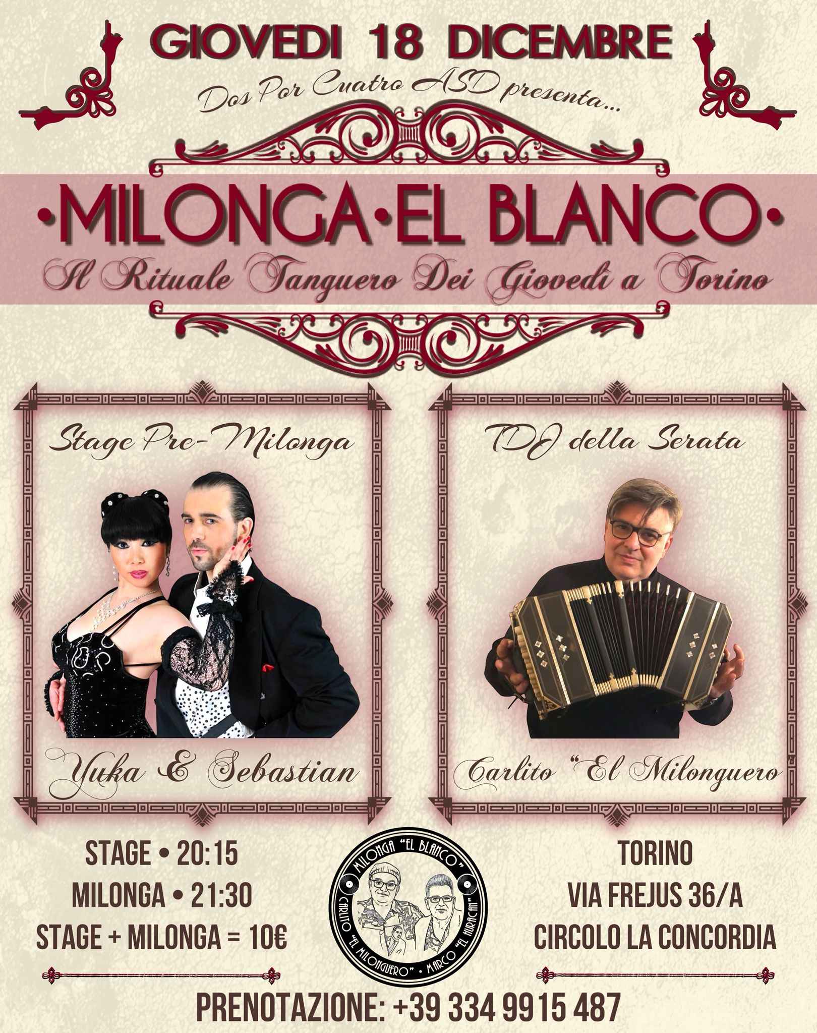 🪩milonga "el Blanco"🗓️giovedì 18 Dicembre ⚜️stage con 💃yuka & Seba🕺 💰 Stage + Milonga= 10€ 🕣20:15~21:15 Stage!! dopo fino all’una Milonga con 🎶tdj Carlito "el Milonguero"🌪️!!! 📍 Circolo “la Concordia” Via Frejus 36/a Torino.🅿️parcheggio interno disponibile solo lato ingresso milonga.🍹 Disponibile il servizio bar interno alla sala.🪑 Prenotazione tavoli al Numero +39 334 99 15 487 è consigliata!🚸info Stage Yuka & Seba: +39 327 85 60 253👉evento: https://fb.me/e/5BHrKap1I