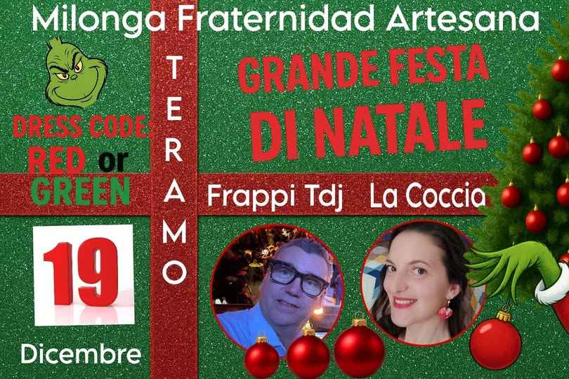 Milonga fraternidad Artesana – TERAMO GRANDE Festa DI NATALE VENERDÌ 19 Dicembre 2055 “Tutta la poesia del Natale in un abbraccio di Tango” evento tanguero imperdibile grinch Edition dress Code: Red & green — Scegli il tuo Natale! Programma della serata: Ore 20:00