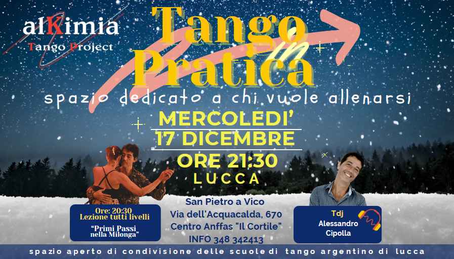 L'’idea di base è quella di offrire a chi studia Tango Argentino, la possibilità di frequentarsi e divertirsi insieme, incontrando ballerini e studenti di tutte le altre scuole che vorranno partecipare alle serate, per crescere e praticare, non solo le sequenze apprese durante le lezioni, ma anche la gestione degli spazi in milonga, la circolarità, i codigos che caratterizzano le serate del tango argentino nella milongas.questa serata informale è resa possibile grazie all’appoggio dell’associazione A.n.f.f.a.s. di Lucca, la quale ci ha gentilmente concesso la disponibilità i bellissimi locali denominati “il Cortile di Casa nostra”, in Via dell’acqua Calda, 670, a San Pietro a Vico (Lu), a circa 3 Km dal centro della città.in sala saranno presenti gli insegnanti della nostra scuola per offrire i loro insegnamenti ed accompagnare coloro che ne faranno richiesta, nella corretta esecuzione di movimenti, passi, sequenze apprese nelle rispettive scuole e che desiderano allenare durante la serata.