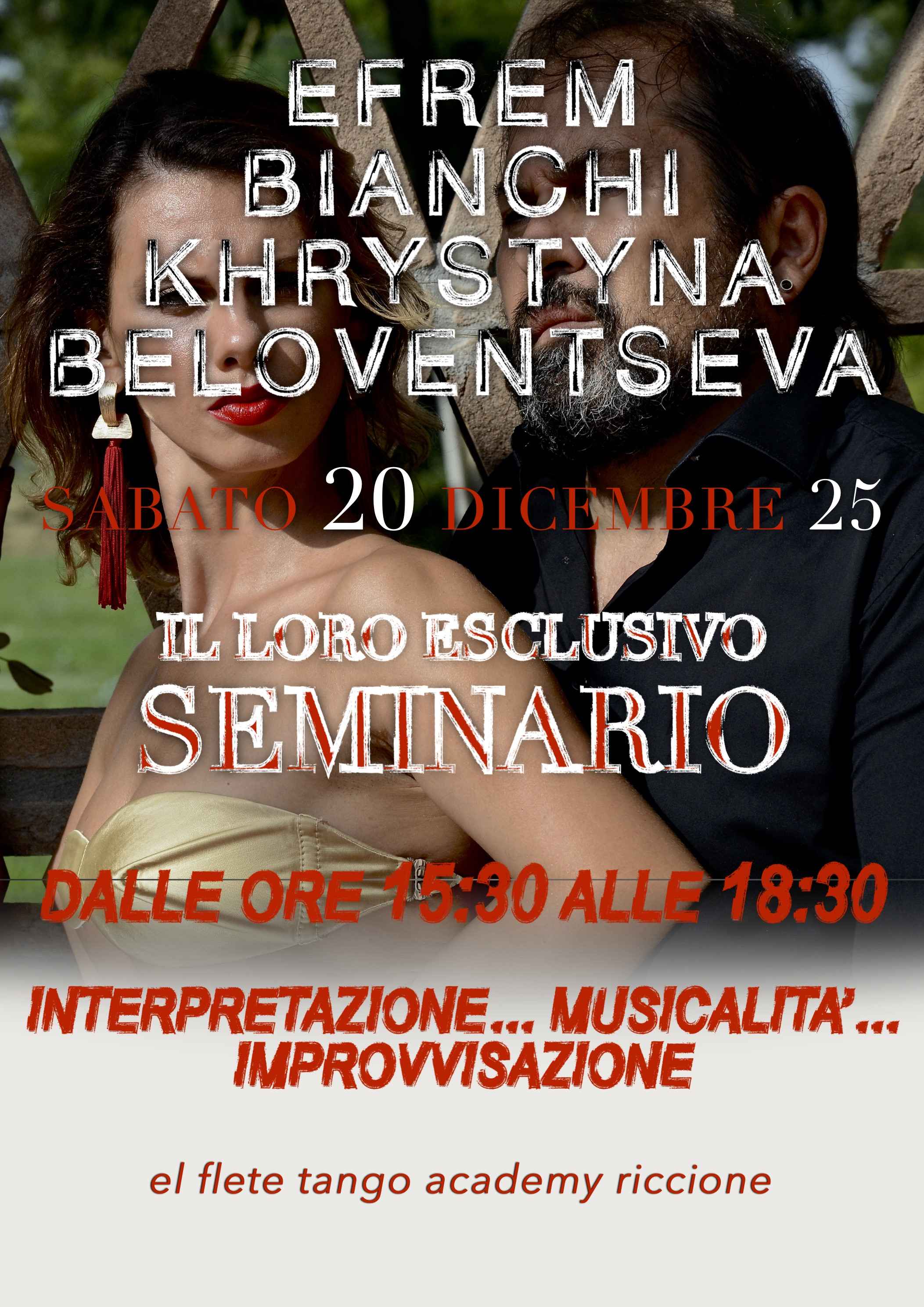 I maestri Efrem Bianchi y Khrystyna Beloventseva propongono il loro Seminario intensivo: percorso dedicato alla interpretazione, musicalità e improvvisazione marca e struttura. Presso la "el Flete Tango Academy Riccione" un pomeriggio di studio e approfondimenti. Analizzeremo gli elementi, le tecniche e le dinamiche fondamentali per imparare e migliorare il proprio stile di ballo realizzando sequenze e dinamiche complesse. L'academy dispone di 3 sale dedicate con pavimento tecnico e ammortizzato. Lezioni individuali, tecnica femminile (domenica mattina 10:30-12:00), Stage. Info 333.5802524-331.4071781- costo dell'evento € 15 per partecipante (max 6/8 coppie di studio in sessione per ballerini con buona conoscenza del Tango).