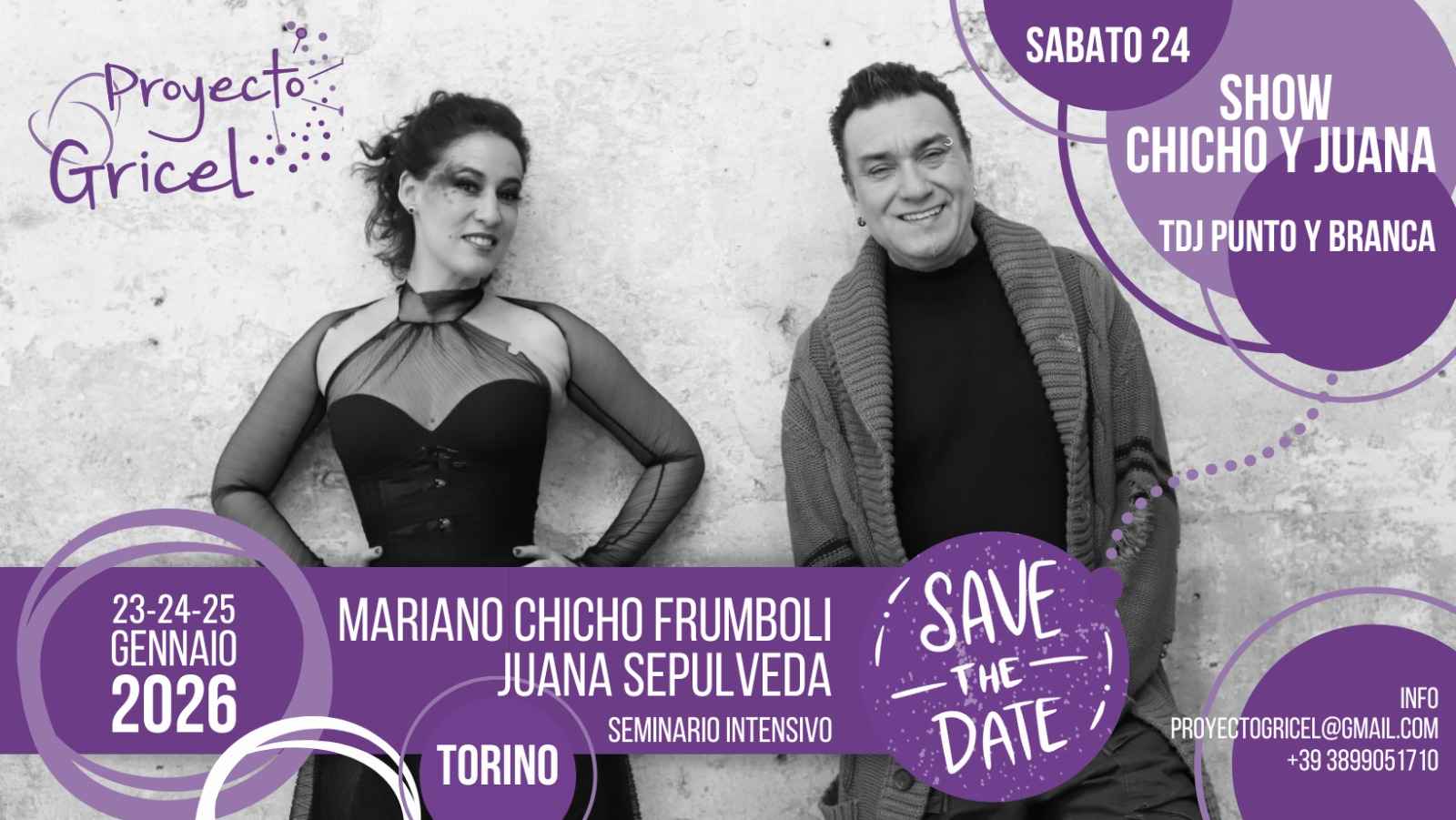 (include la Practica Gricel di venerdì 23)seminario di Tecnica Individuale (2 ore con Juana Sepulveda): €30practica Gricel (venerdì 23): €10gran Milonga Gricel (sabato 24): €15 entro il 16/01/2026