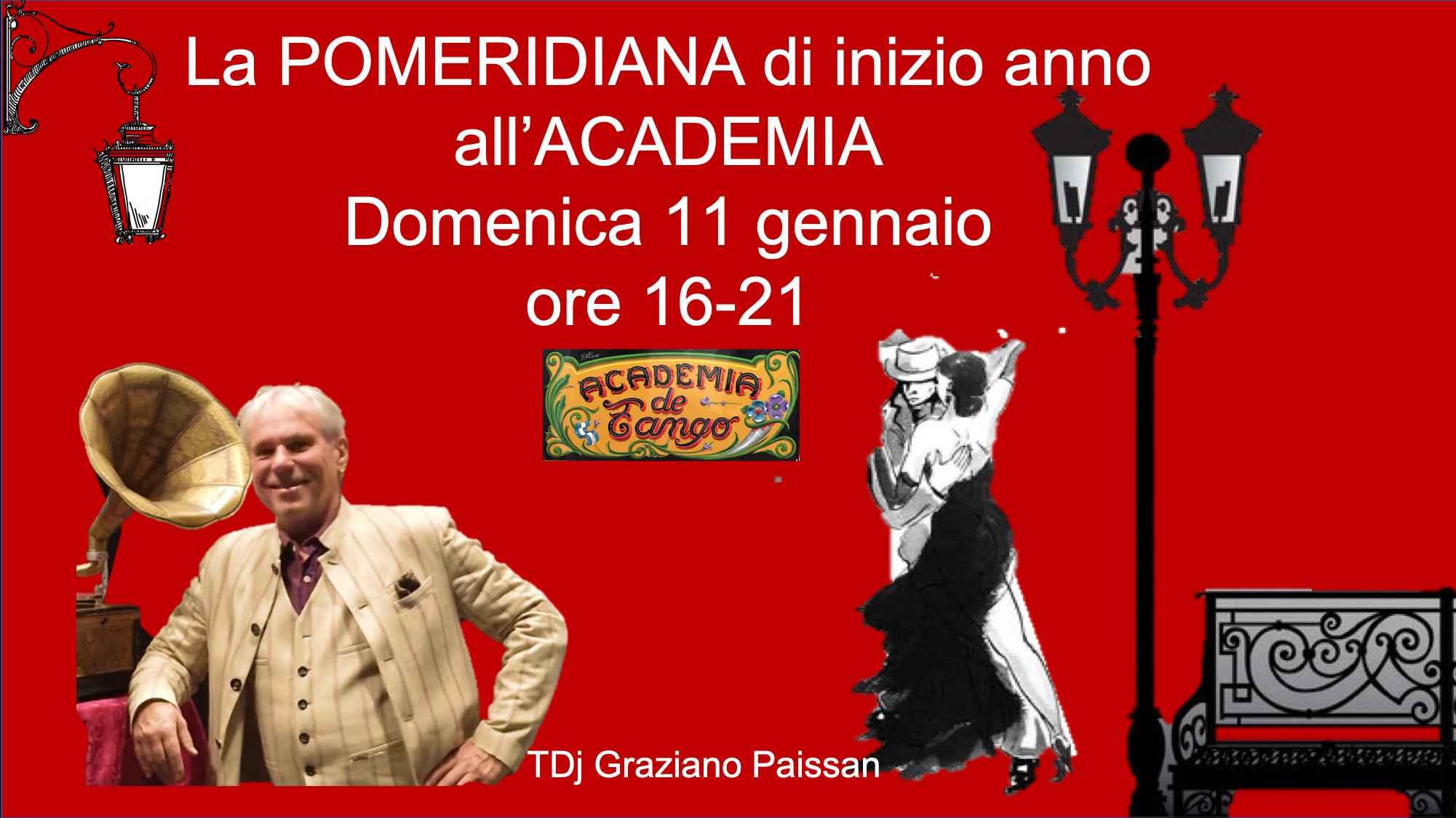 La prima Pomeridiana  del nuovo anno all'academia ore 16-21. Tdj Graziano Paissan tango tradizionale con inserimento di qualche orchestre contemporanee, tonda rosa, tango loca e tanda nuevo