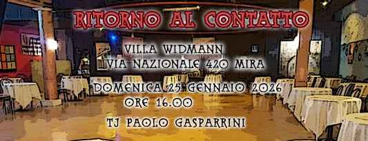 Silvana, mitica gestrice del Contatto vi invita ad una pomeridiana in villa Widmann, via nazionale 420 Mira. Domenica 25 gennaio 2026 ore 16 alle 21 Ricreeremo lo stesso spirito e calore del Contatto, perché ci manca tanto quel ritrovarsi con tanti amici, bella musica e buon tango. . Ce le suona Paolo Gasparrini. Ricco buffet con beveraggi, vi manderemo a casa stanchi e felici. Soci acsi contributo 15 euro. L'evento avrà scadenza mensile.prenotazioni a Silvana 3407861032. Clara 3932262695 Per chi viene da Venezia comodissimo bus 53e fermata "mira Riscossa"si ferma proprio davanti alla villa, anche per il ritorno.