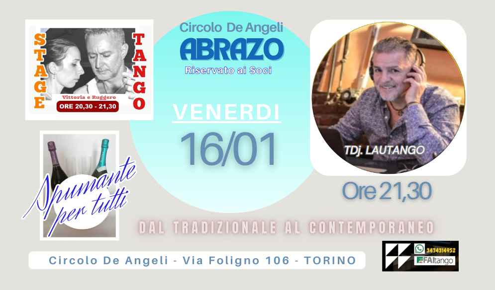 tornano i venerdì alla milonga Abrazo Venerdì 16 gennaio. Dove si balla, si chiacchera, e si sta insieme in allegria! Stage Dalle 20,30 alle 21,30 con Vittoria E Ruggero argomento della serata, riconoscere le Orchestre nel Tango, ci sarà buffet e spumante per tutti, dalle 21,30 appuntamento settimanale con Milonga dal Tradizionale al Contemporaneo la selezione musicale sarà a cura del Tdj Giovanni Lauto, sarà l'occasione per ritrovarsi nella nuova sala da ballo di 200 metri con pavimento perfetto e climatizzato, acqua free e si balla fino alle 0,30. Contributo Stage piu milonga 12€solo milonga 10€, comodo il parcheggio nelle vicinanze.