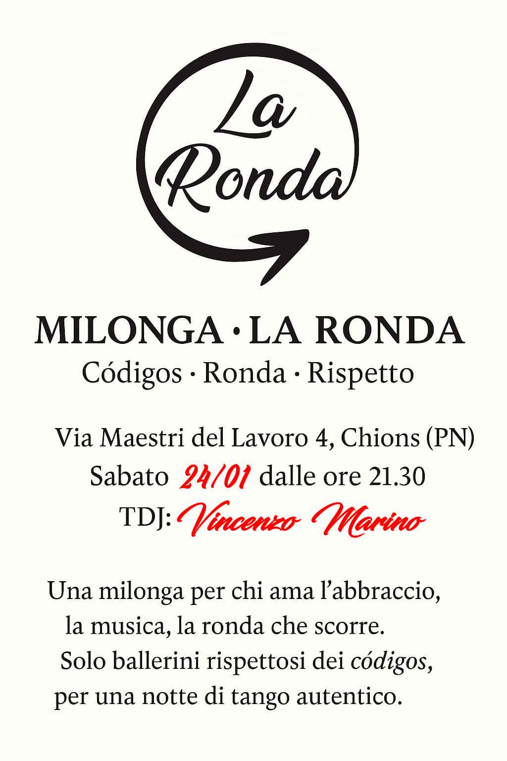 C'è un nutrito gruppo di persone che ama il tango milonguero: fatto di educazione, rispetto e musica.persone che non vanno a ballare per mostrarsi, ma per condividere momenti di puro piacere in abrazo cerrado. per queste persone nasce La Milonga – La Ronda di Chions.