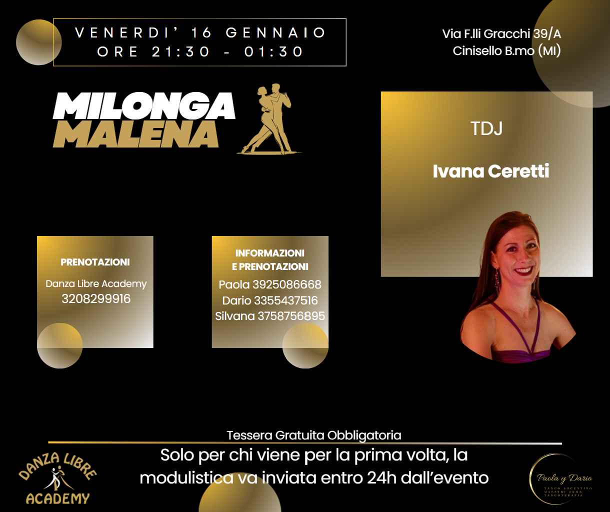 Il Venerdì è Milonga Malena, la milonga fatta da ballerini, per i ballerini! Prima serata del 2016 con Milonga Malena, ripartiamo dopo le Feste per divertirci alla grande!l'anno inizia con un'ospite d'eccezione in consolle: la bravissima Ivana Ceretti ci farà ballare tutta la sera con l'energia e la classe che la contraddistinguono!