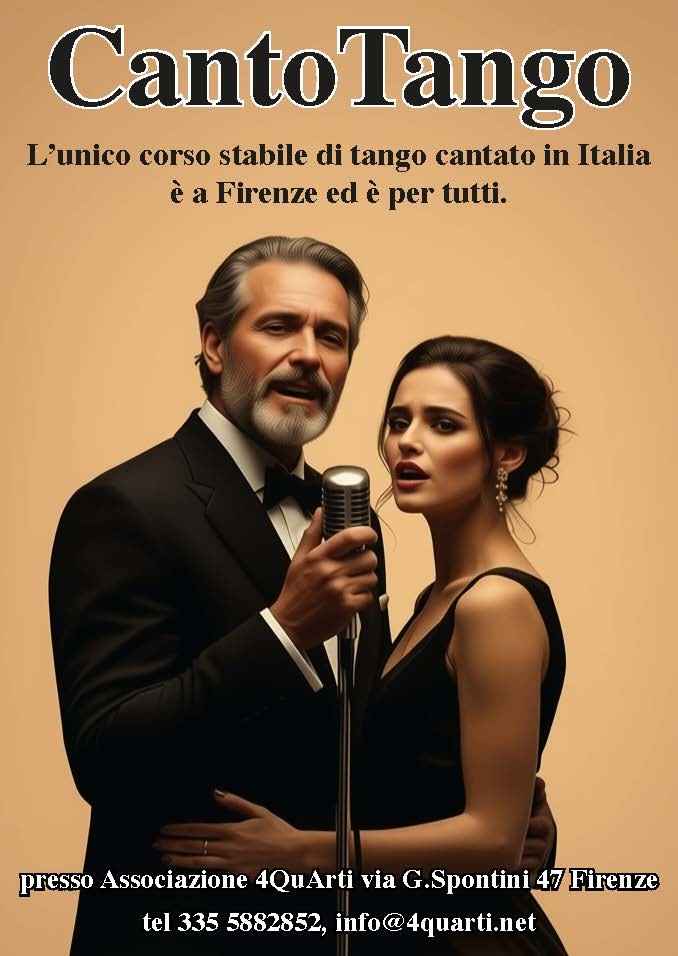 L'unico corso stabile di Tango cantato in Italia si svolge a Firenze con un calendario di incontri che va da Ottobre a Giugno. E' organizzato in trimestri e ognuno prevede sei appuntamenti. Il laboratorio è di gruppo e si avvale una volta a trimestre della collaborazione del pianista, arrangiatore e compositore Fabrizio Mocata. Docente del corso è Mya Fracassini, cantante e didatta che ha approfondito lo stile e il repertorio del tango cantato, avendo collaborato con molti musicisti e formazioni, italiani ed argentini. Le lezioni si tengono due sabati al mese presso l'associazione 4quarti in via Spontini 47 a Firenze.il corso è rivolto ad amatori e appassionati, non è necessaria esperienza precedente ma solo passione ed entusiasmo!per informazioni: 3355882852 (telefono e whatsapp) email: info@4quarti.net oppure cantotangolab@gmail.com