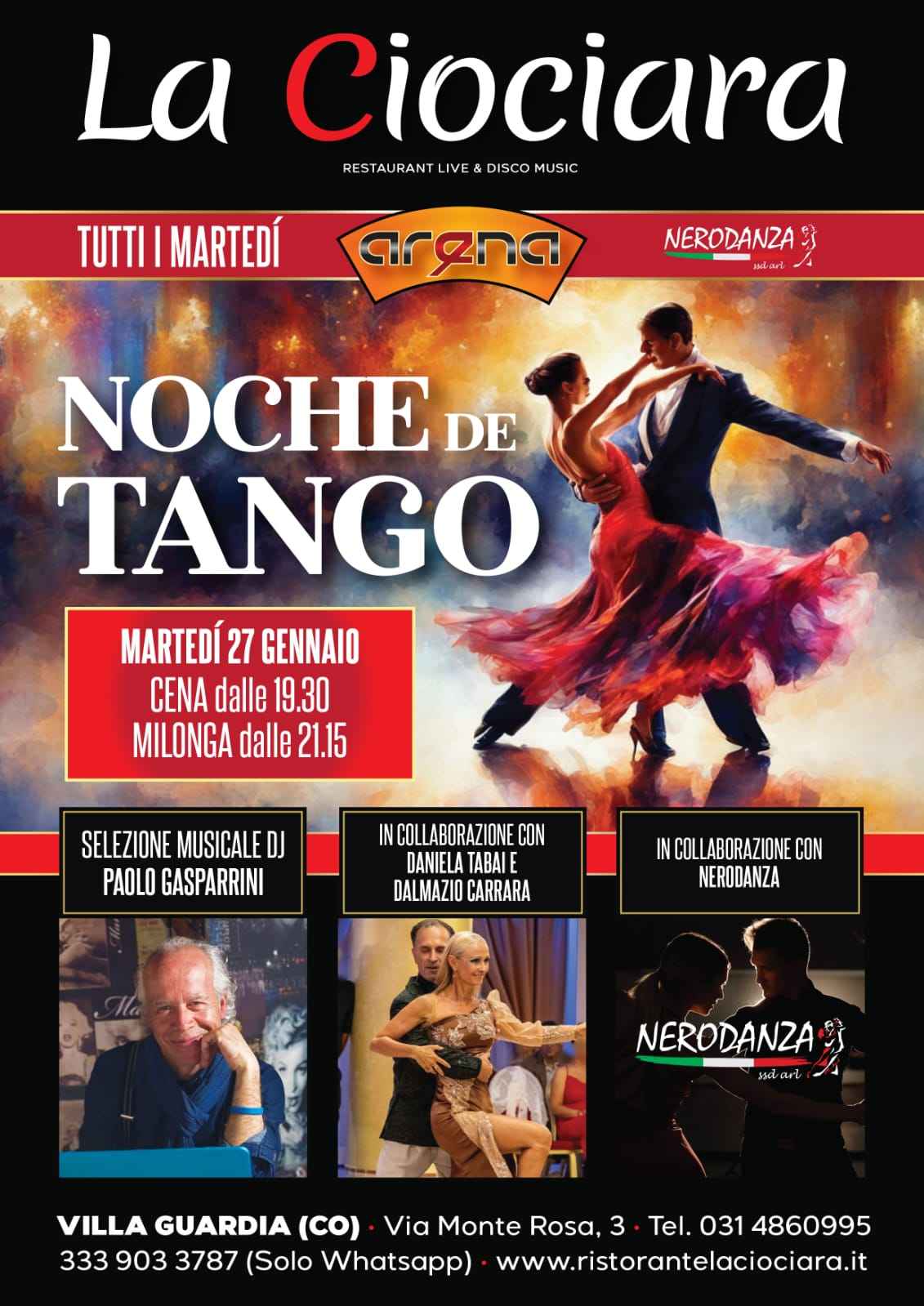 PRENOTAZIONE Obbligatoria Per La Cenachiamando il 031-4860995 o messaggiando su whatsapp al nr 333-9033787 ‐-------------------------in collaborazione con scuola di ballo Nerodanza Bulgarograsso corsi di Tango Argentino con i maestri Dalmazio Carrara e Daniela Tabai