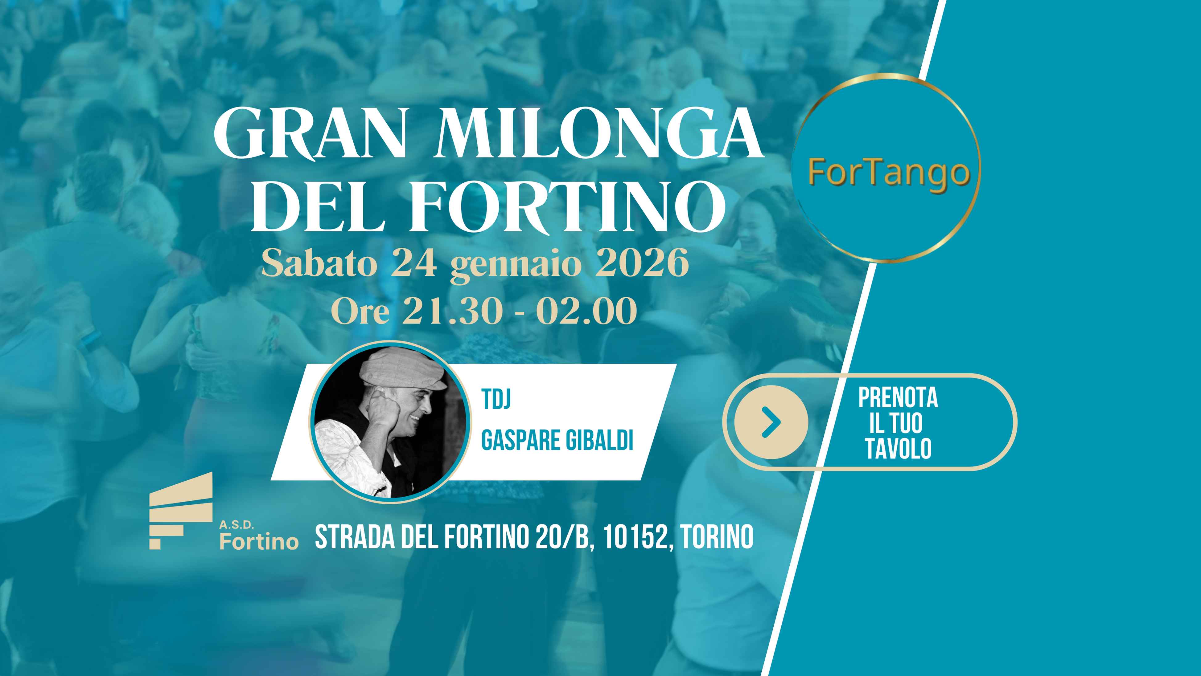 Sabato 24 Gennaio 2026 alle ore 21.30 ti aspettiamo per la Gran Milonga del Fortino, nel nostro bellissimo salone con 500mq di parquet.