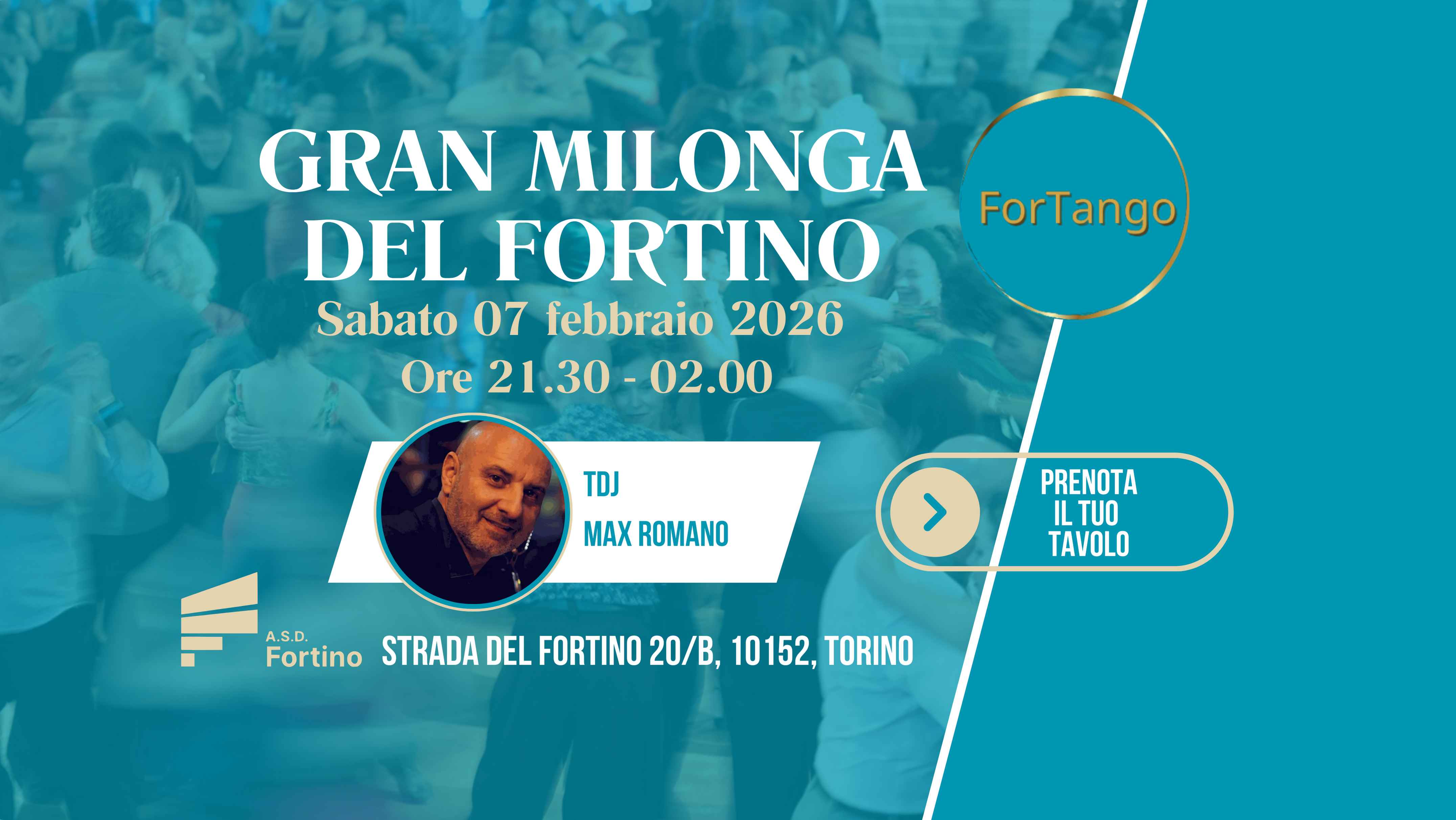 Sabato 07 Febbraio 2026 alle ore 21.30 ti aspettiamo per la Gran Milonga del Fortino, nel nostro bellissimo salone con 500mq di parquet.