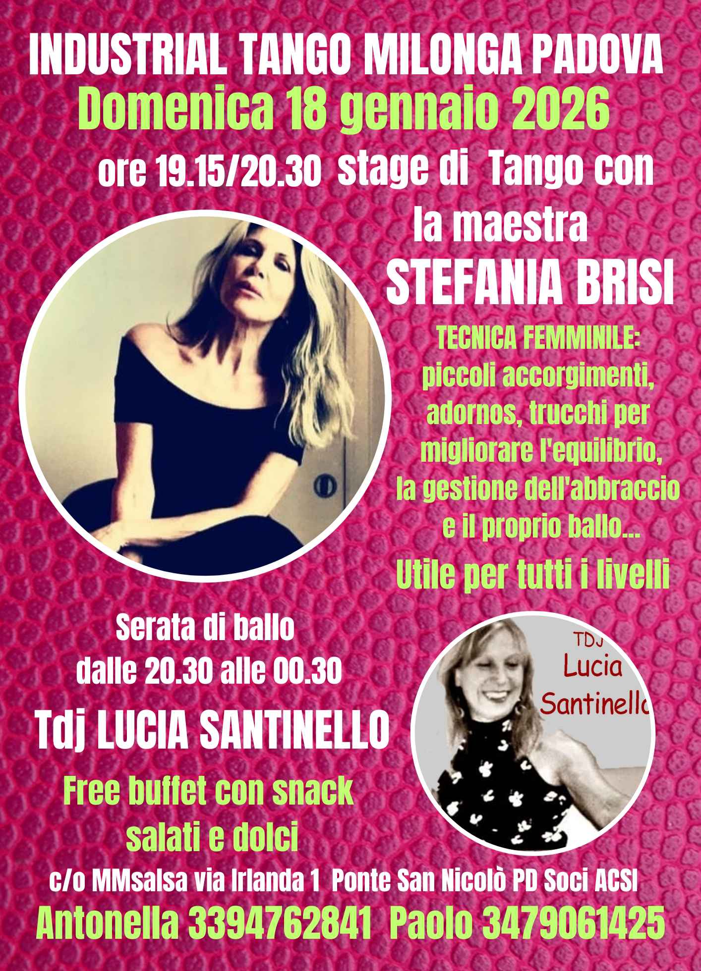 Domenica 18 gennaio 2026ospite speciale della serata la maestra Stefania Brisiore 19.15/20.30 Stage Di Tecnica Femminile: piccoli accorgimenti, adornos o trucchi per migliorare l'equilibrio, la gestione dell'abbraccio e il proprio ballo...per follower ma anche per coppie. Utile per tutti i livelli