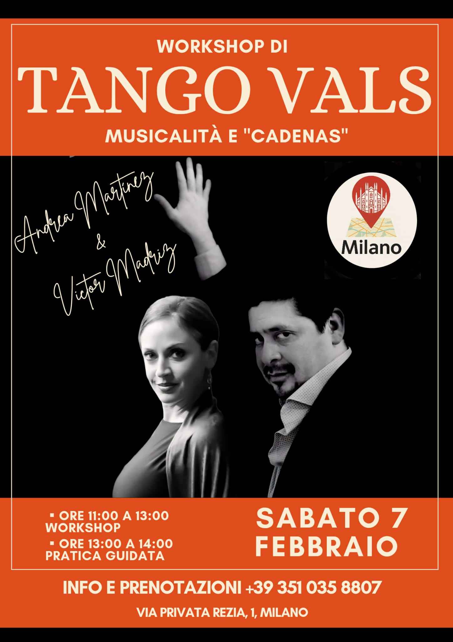 🫂 Per Tangheri curiosi, coraggiosi e con voglia di crescere nel loro ballo proponiamo un workshop ben strutturato per riuscire a distinguere i principali elementi interpretativi del Vals Argentino (conosciuto anche come "tango Vals").il programma ha lo scopo d'individuare gli aspetti che differenzano il vals dal tango, sia nella musicalità che nei movimenti. Ritmica e Frassegio del Tango Vals e Sequenze in "cadenas" saranno il fulcro del Workshop.💃🕺a guidarvi in questo percorso ci saranno Andrea Martínez (Arg) e Victor Madriz (Ven/arg), due maestri con tantissima esperienza nell'insegnamento e nel ballo del Tango Vals.📢 I posti sono limitati per assicurare una esperienza pedagogica di eccellenza, quindi la prenotazione è obbligatoria (Whatsapp, Sms o telefonata) al 347 930 3077 Andrea, ovvero 351 035 8807 Victor⚠️È consigliato venire in coppia. Per le persone singole cercheremo di trovare un partner, dopo di che sarà confermata l'iscrizione.🗓️il workshop si terrà il Sabato 07/02 in Via Privata Rezia, 1 (zona Porta Romana), Milano.dalle 11.00 alle 13.00. A seguire ci sarà un'ora di pratica guidata dai maestri per mettere in moto e correggere "in caldo" tutto quanto appena imparato, nel frattempo un giro 🍕 pizza per tutti!🙏🏻 Il contributo per l'intera attività è di €25 a persona.😘vi aspettiamo con tutta "la onda" e l'affetto dell'abbraccio tanguero!