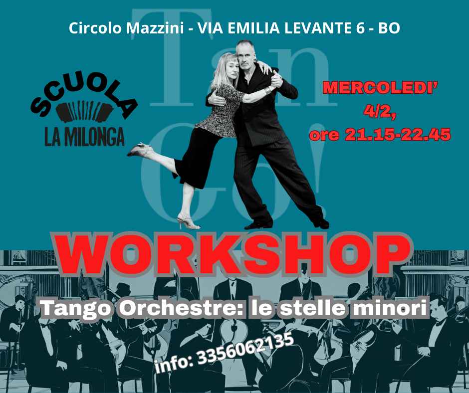 Workshop di Tango: Le Stelle Minoriper presentare il Nuovo Quadrimestre Di Studio della Scuola La Milonga(dal 9/02 al 25/05 2026 il lunedì sera, ore 21.30)con Tobias Bert e Annalisa di Luziosi continua il percorso nei sentieri dell’ascolto Consapevole e differenziato delle Orchestre di Tango. Dopo aver sperimentato i sentieri principali tracciati da D’arienzo, Di Sarli, Troilo, Pugliese, ora andiamo a scoprire, con qualche arbitraria semplificazione, gli allievi, i seguaci e i compagni di strada e di epoca dei 4 grandi maestri: Orchestre con distinte personalità e raffinati musicisti, Stelle Minori che riempiono di luce e colori le nostre nottate di tangomercoledì 4 febbraioore 21.15- 22.45prezzo Promozionale: 10 euro a personasi consiglia di prenotare in coppiainformazioni: 3356062135circolo Mazzini, via Emilia Levante 6, Bologna