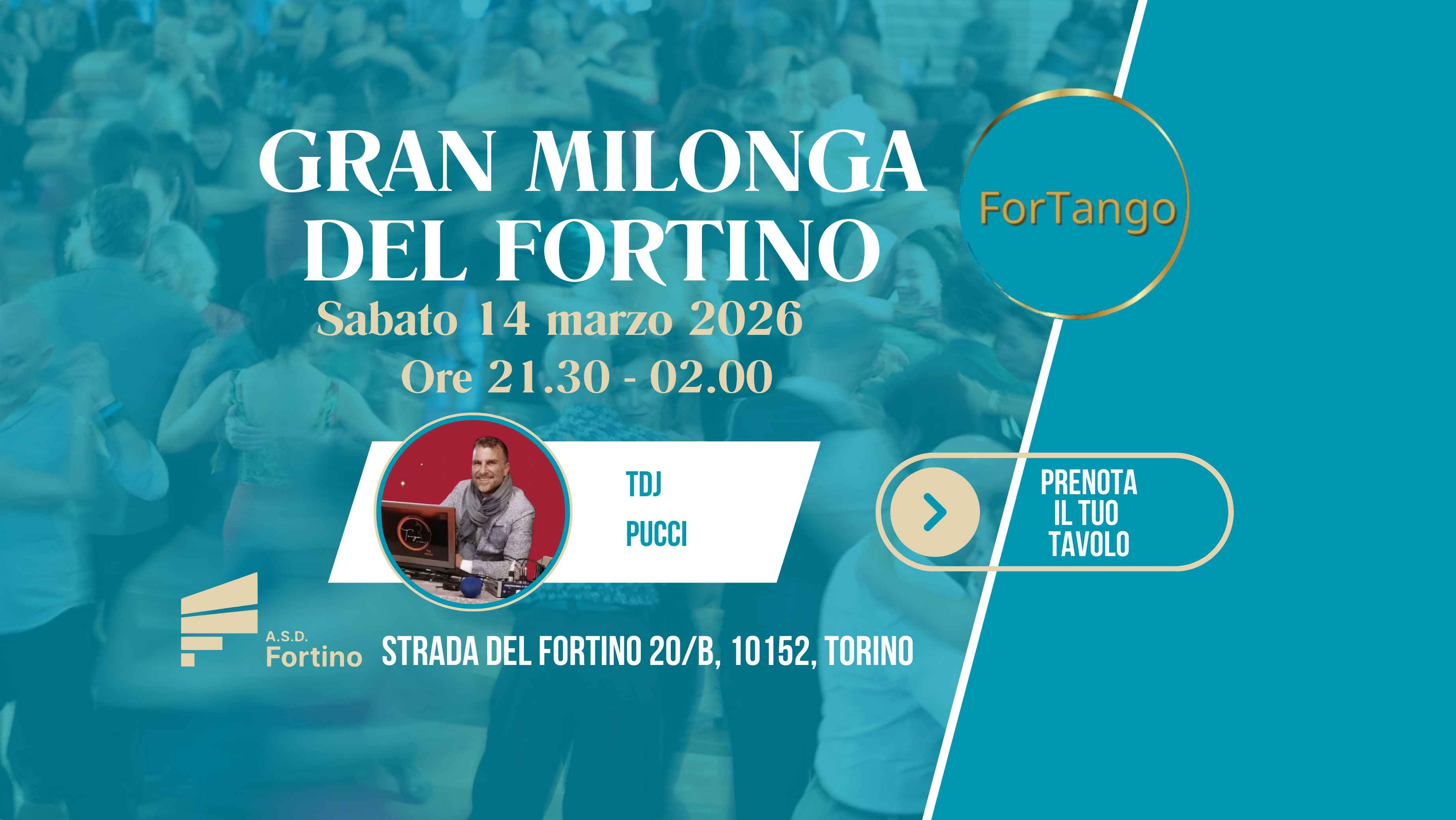 Sabato 14 Marzo 2026 alle ore 21.30 ti aspettiamo per la Gran Milonga del Fortino, nel nostro bellissimo salone con 500mq di parquet.