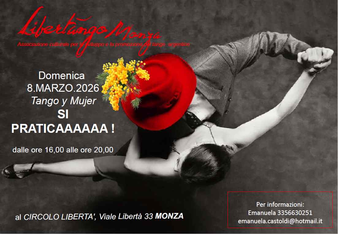 Pratica Mensile di Tango – Domenica Pomeriggio dalle 16:00 alle 20:00📍 Dove: Monza Via Libertà 33 Circolo Libertà🎶 Cosa: Una pratica libera di Tango Argentino, pensata per ritrovarsi, ballare, chiacchierare e condividere la passione in un ambiente caldo e accogliente🧉 Atmosfera: rilassata, con musica di Tango tradizionale e spazi per socializzare💸 Ingresso: Con offerta libera – il contributo è volontario e apprezzato👥 Aperta a tutti: Non è necessario essere in coppia o iscritti a una scuola