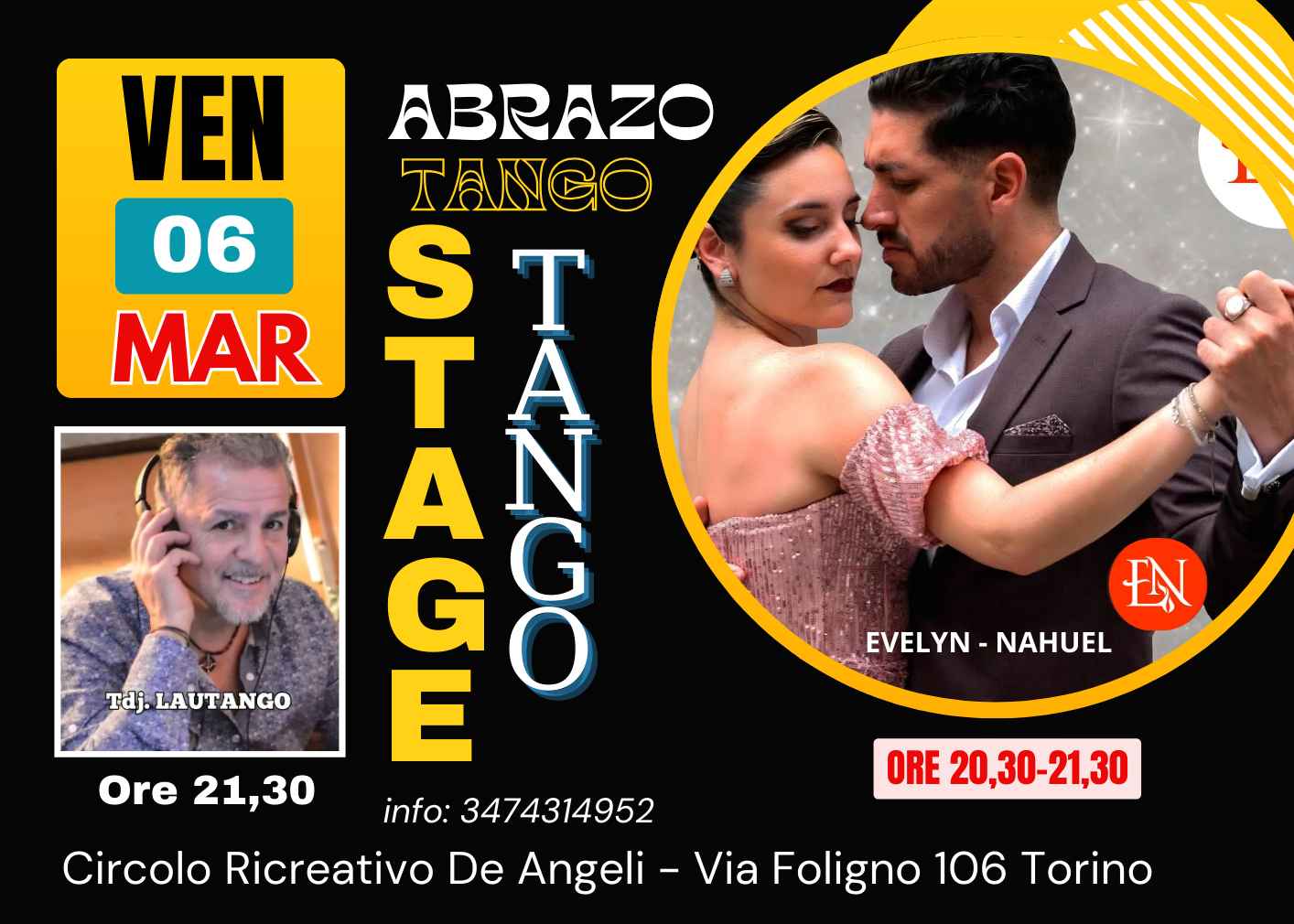 VenerdÌ 06 Marzo abrazo la Milonga dove si balla, si chiacchera, e si sta insieme in allegria! Torna la coppia di Maestri Argentini strepitosi Evelyn e Nahuel con lo stage di Tango dalle 20,30 alle 21,30 ci sarà buffet e bere free per tutti, dalle 21,30 appuntamento settimanale con Milonga dal Tradizionale al Contemporaneo la selezione musicale sarà a cura del Tdj Lautango, sarà l'occasione per ritrovarsi nella nuova sala da ballo di 200 metri con pavimento perfetto e climatizzato, acqua free e si balla fino alle 0,30. Contributo Stage piu milonga 12€solo milonga 10€, comodo il parcheggio nelle vicinanze.