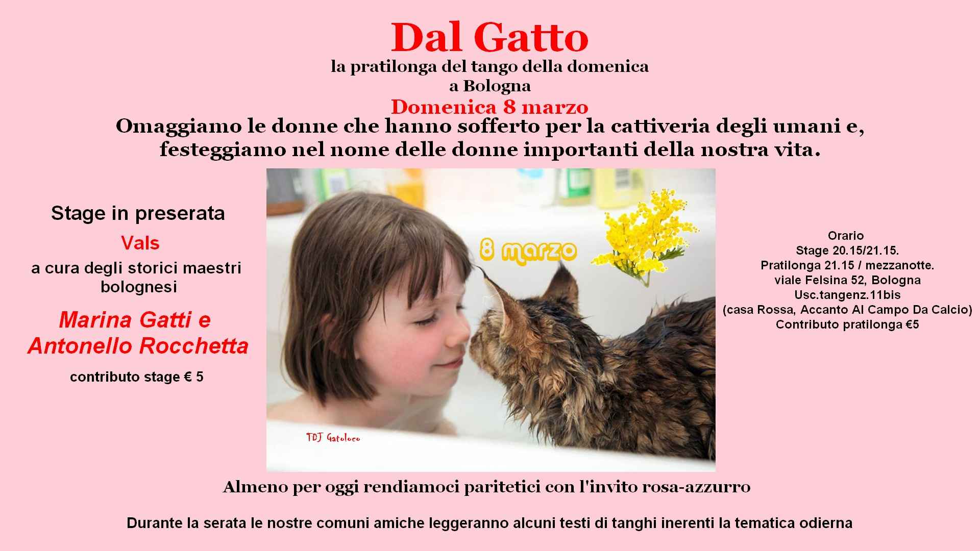 Omaggiamo le donne che hanno sofferto per la cattiveria degli umani e, festeggiamo nel nome delle donne importanti della nostra vita. Durante la serata le nostre comuni amiche leggeranno alcuni testi di tanghi inerenti la tematica odierna. Questa sera stage "vals": a cura degli storici maestri bolognesi Marina Gatti e Antonello Rocchetta dalle ore 20,15 alle 21,15, contributo stage € 5.00.si balla il tango in tutte le sue versioni dalle 21,15 alla mezzanotte. tdj El Gatoloco (Resident)