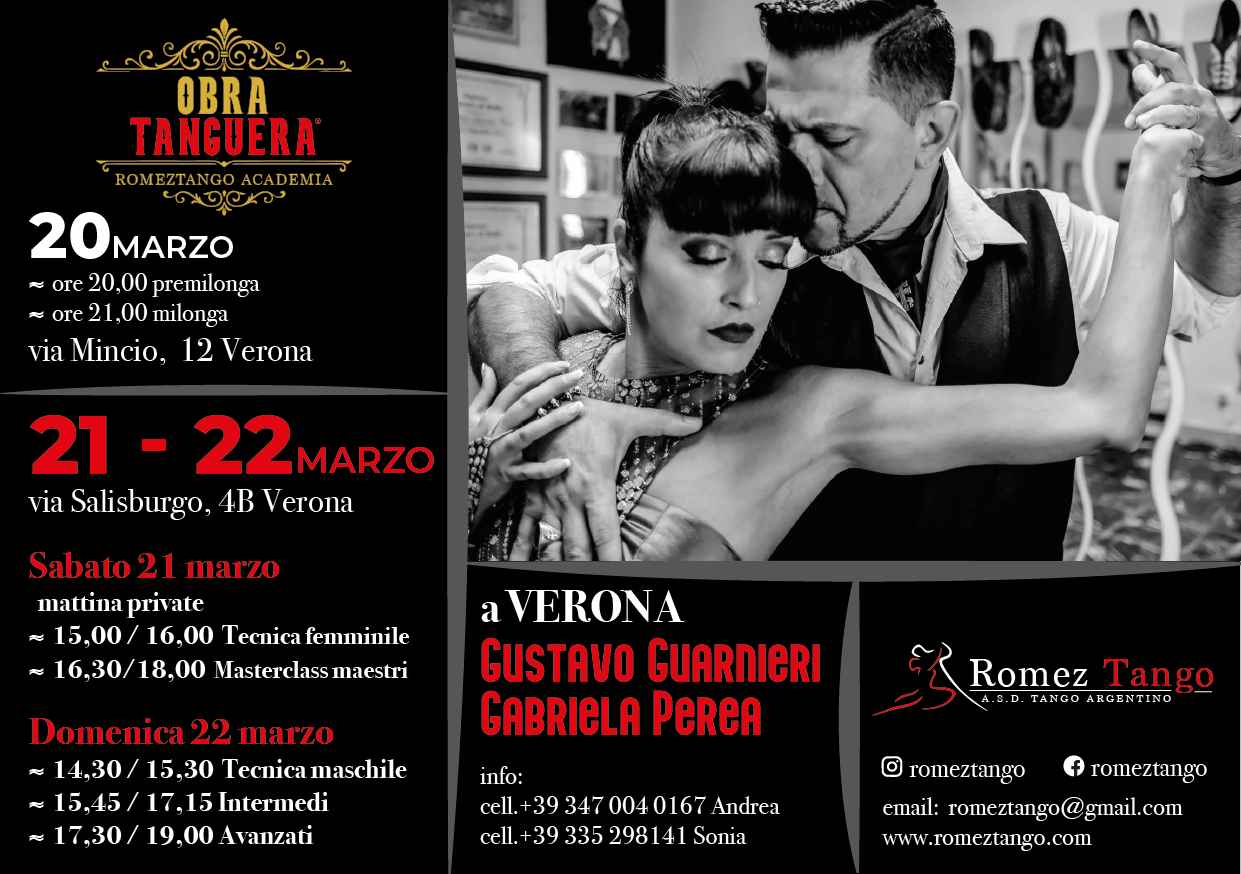 Prenotazioni aperte per il percorso di Stage di Obra TANGUERA, l’accademia di Romeztango! Studio di alto livello dedicato a ballerini e insegnanti, con i maestri internazionali Gustavo Guarnieri e Gabriela Perea che tornano ospiti a Verona per proseguire il progetto di Obra Tanguera: eventi nazionali esclusivi a Verona, studio, consapevolezza e cultura tanguera.